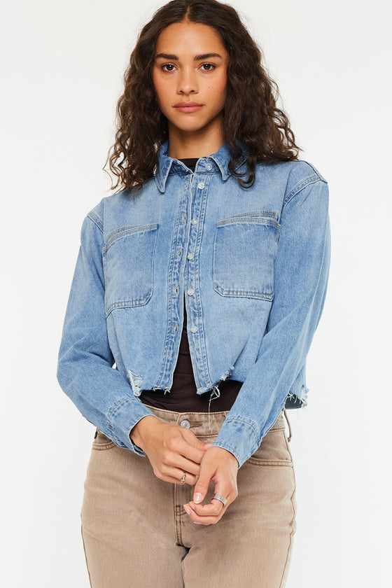 Gemmi is a Light wash denim shirt that is cropped and finishes slightly by the belly button. This shirt has 2 front double patch pockets. Features a full button closure, small back pleats and a drop shoulder. The perfect light weight shirt perfect for any occasion.