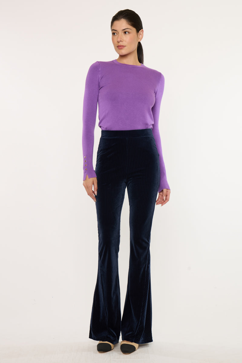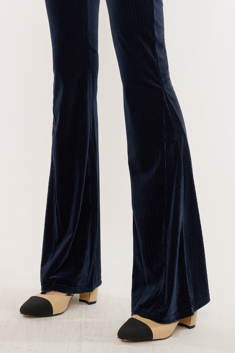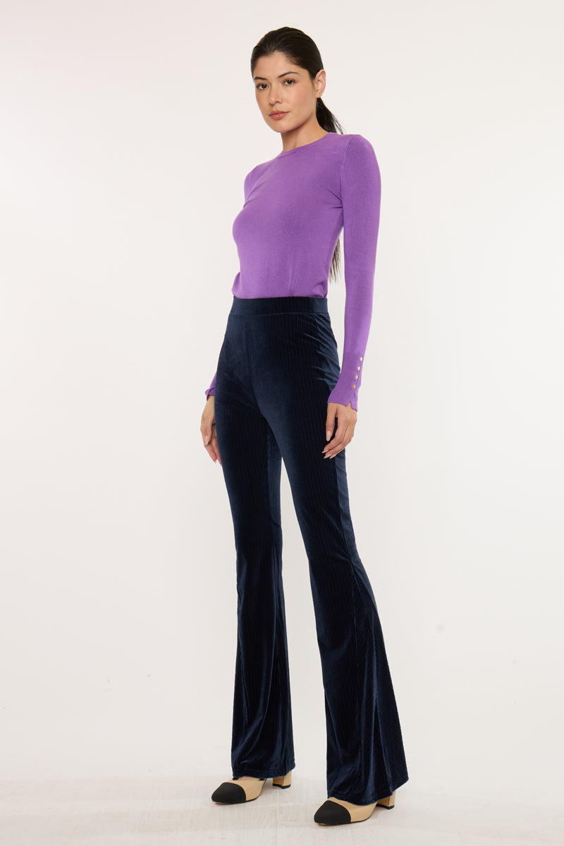 Dance the night away with these sultry and velvety, Gracey High Rise Flare Pants. These navy-colored flares sit above the waistline and flare out to the bottom. Made with our stretch denim for free movement and all-day comfort. Features an elastic waistband and cover stitch bottom. Grab this fashion statement piece to add to your wardrobe!