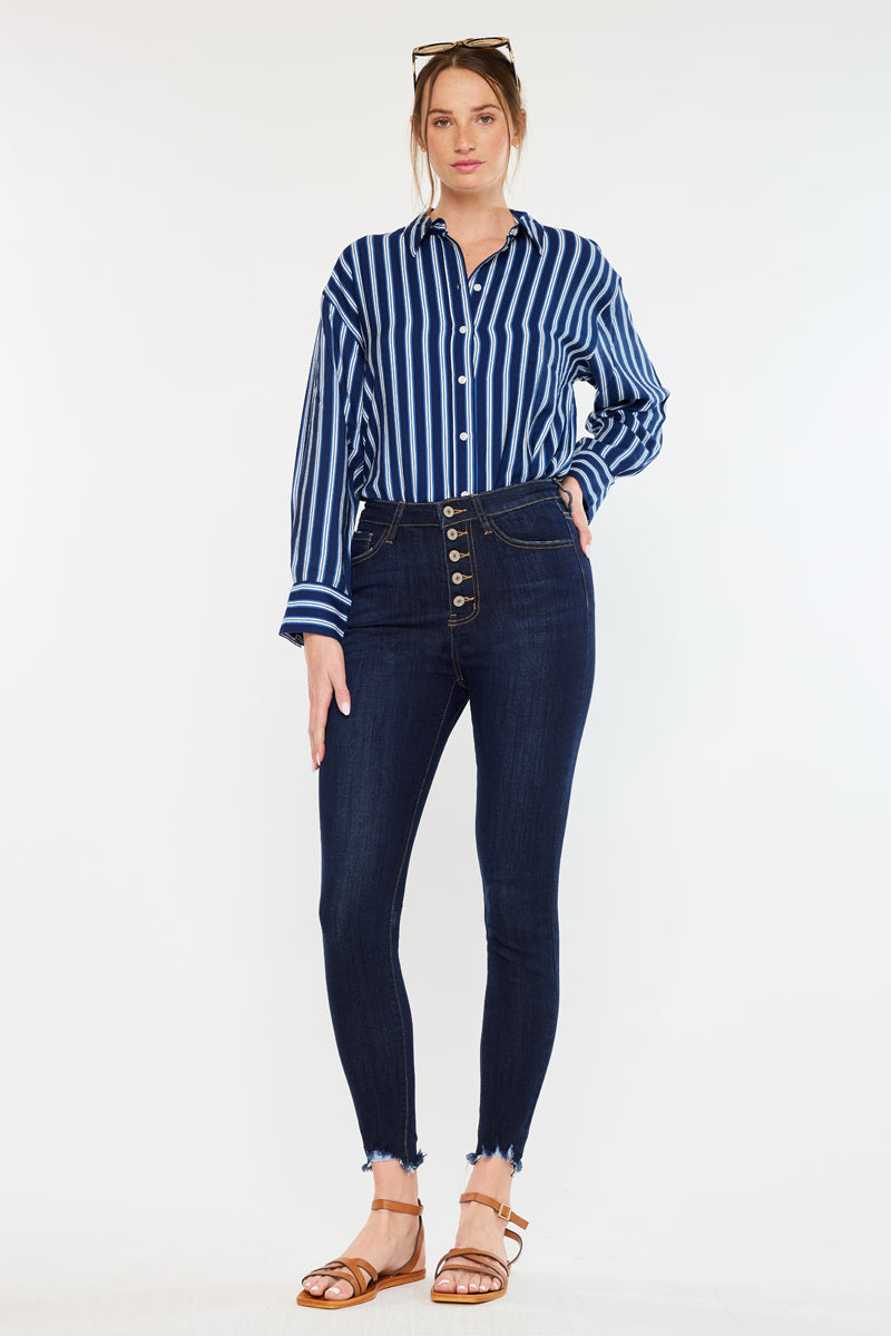 Greyson jeans are our best-selling skinny jeans that is perfect for all seasons. Available in super dark, dark, medium, black, white, dark gray, and light gray colors. Our Greyson jeans fit snug from the hip to the ankle to accentuate and elongate your legs. Features a frayed bottom hem with an exposed five-button fly. This style is high waisted and sits above the natural waistline with just enough durability and stretch that is comfortable for everyday wear.