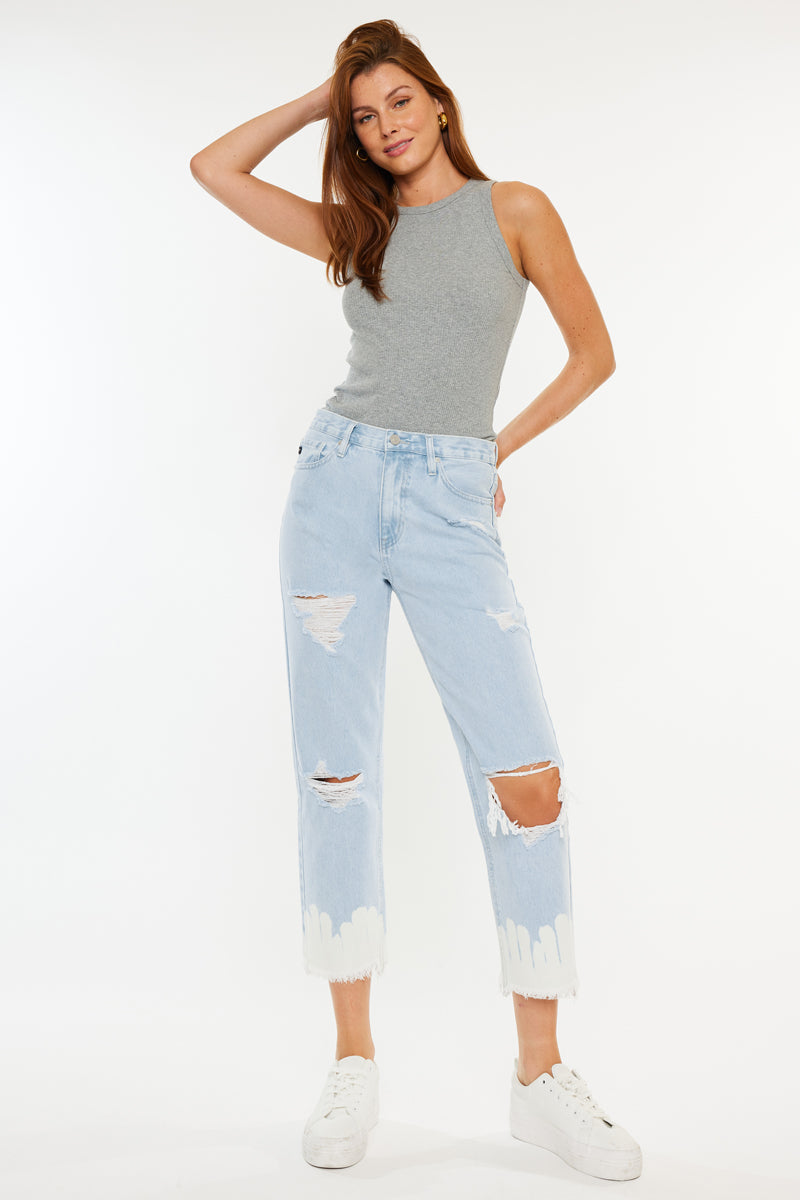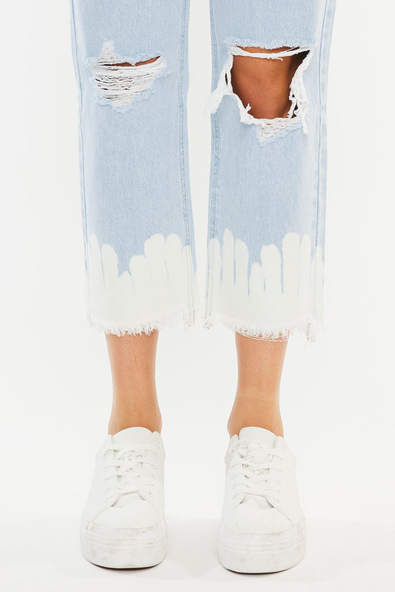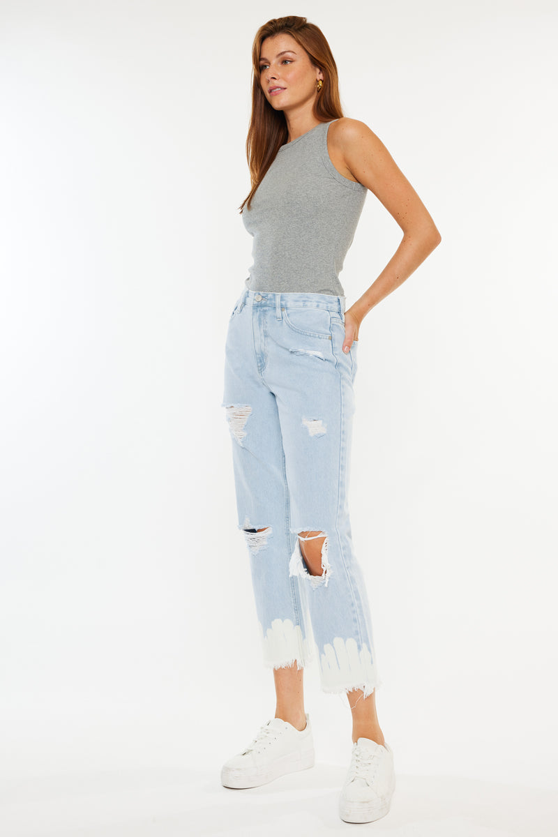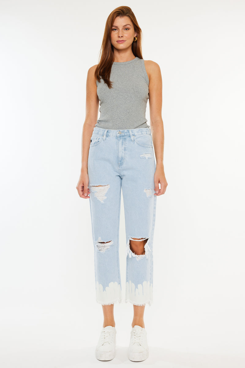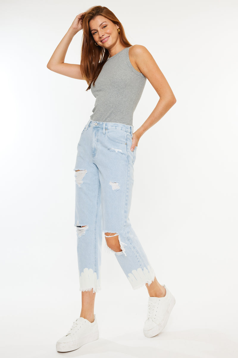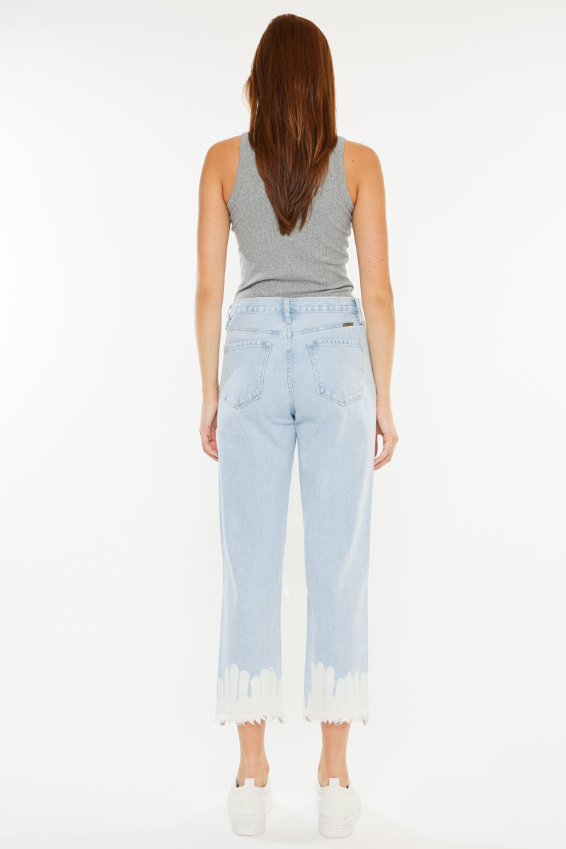 Show off your sleek yet trendy style with this pair of high-rise straight jeans. Featuring a unique bleached bottom and frayed hem. Made with our rigid denim so it won't bag out after multiple wears.