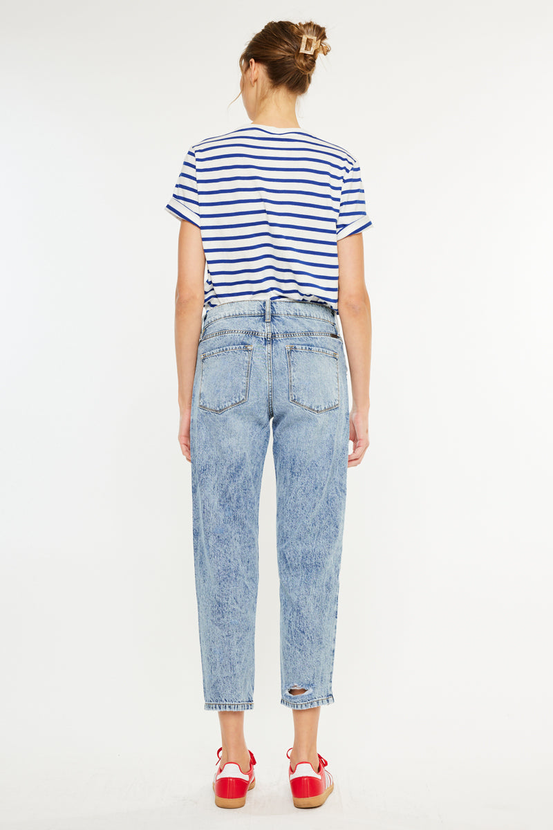 Add edginess to any outfit with this pair of acid-washed relaxed-fit non-stretch mom jeans. Featuring easy tapered fit, slight distressing detail on the hem and throughout, whiskering, a single button zip-fly closure, and a 5-pocket design.
