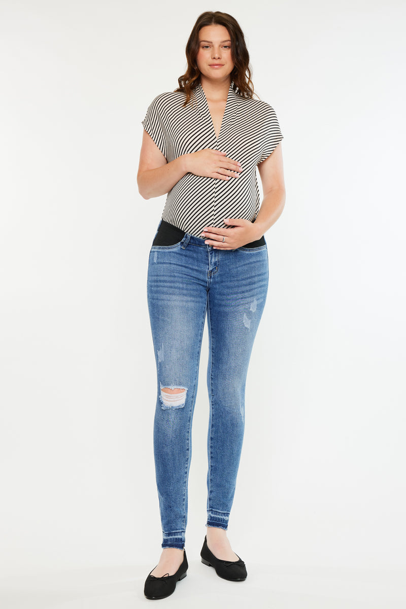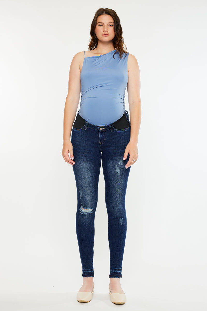 Our Hewitt Super Skinny Maternity Jeans feature a flattering fit with minor distress details and a raw released hem for a chic, lived-in look. Made with comfortable stretch denim that moves with your body and its elastic stretch waist allows even more room for you as you grow. Features two back pockets, a single-button front, and a zip-fly closure.