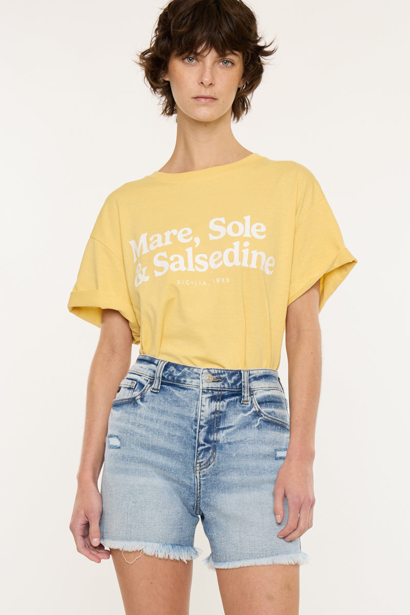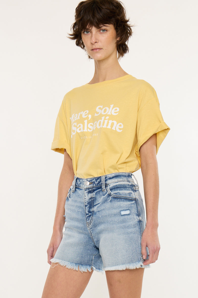 In a captivating medium wash color, our Ingrid Essentials High Rise Shorts. They give that classic denim short style that isn't too short nor too long. Minor contrasting details around the front pockets and waistband. With a frayed hem, 5-pocket style, single button and zipper closure.