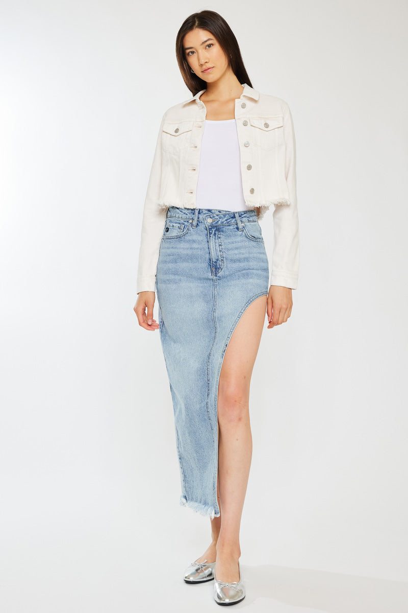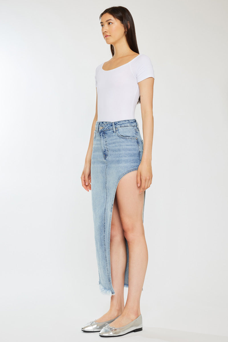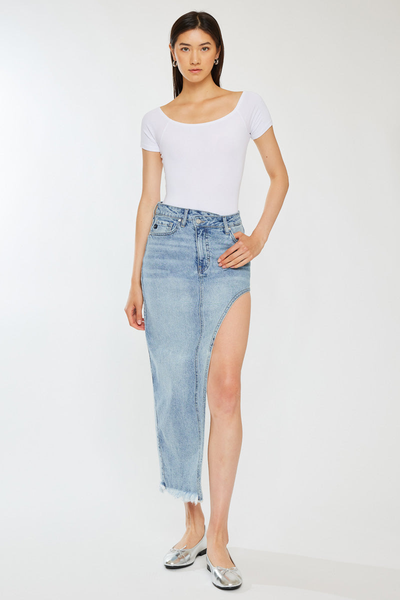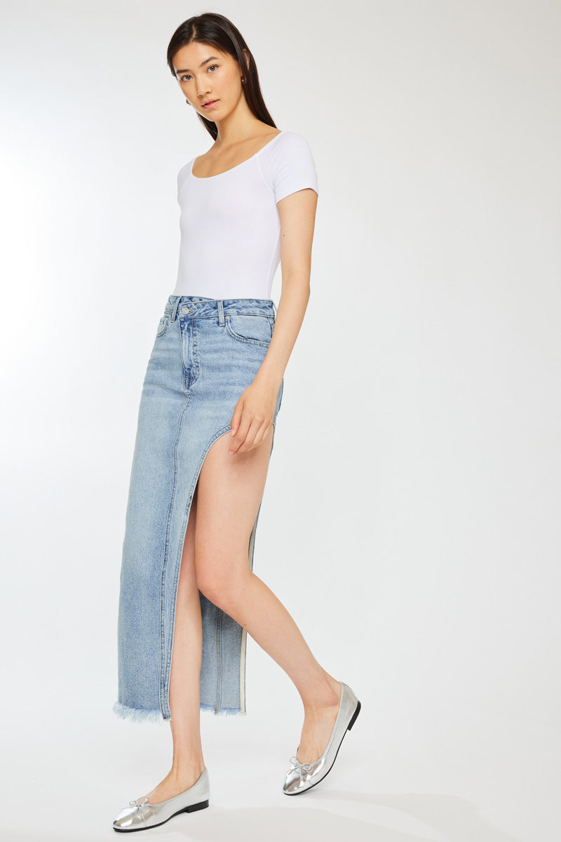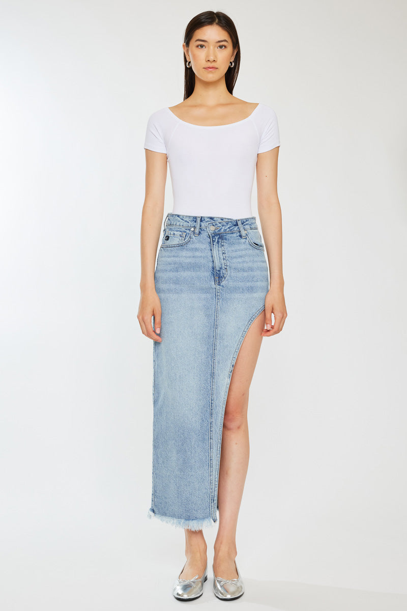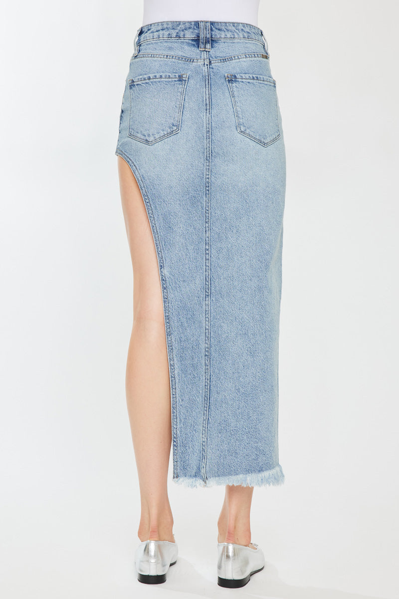 Elevate your wardrobe with this chic maxi skirt, the ideal choice for both daytime and evening wear. Designed to accentuate your silhouette with an S-curve design, this skirt comes in a versatile Medium wash shade. It features subtle whiskering, a unique crossover waistband, the timeless 5-pocket design, and a trendy frayed hem.