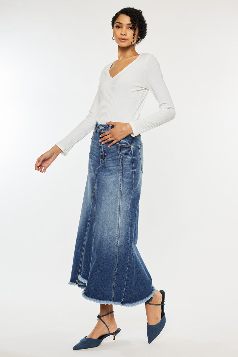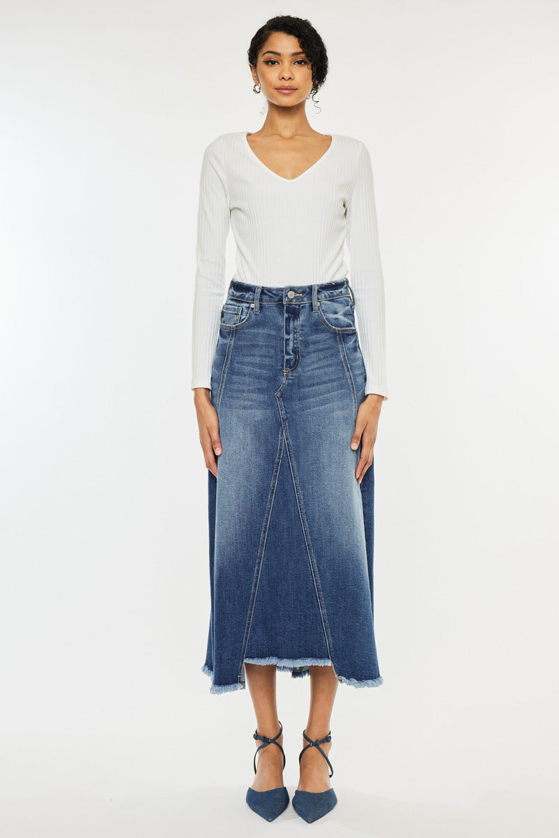 Introducing our stylish denim skirt, perfect for those who love a longer length! This midi skirt features a trendy fray hemming that adds a touch of edginess to your outfit. With its uneven hem details and front seam details, this skirt is a must-have for any fashion-forward individual. Pair it with a casual top or dress it up with a blouse for a versatile and chic look.