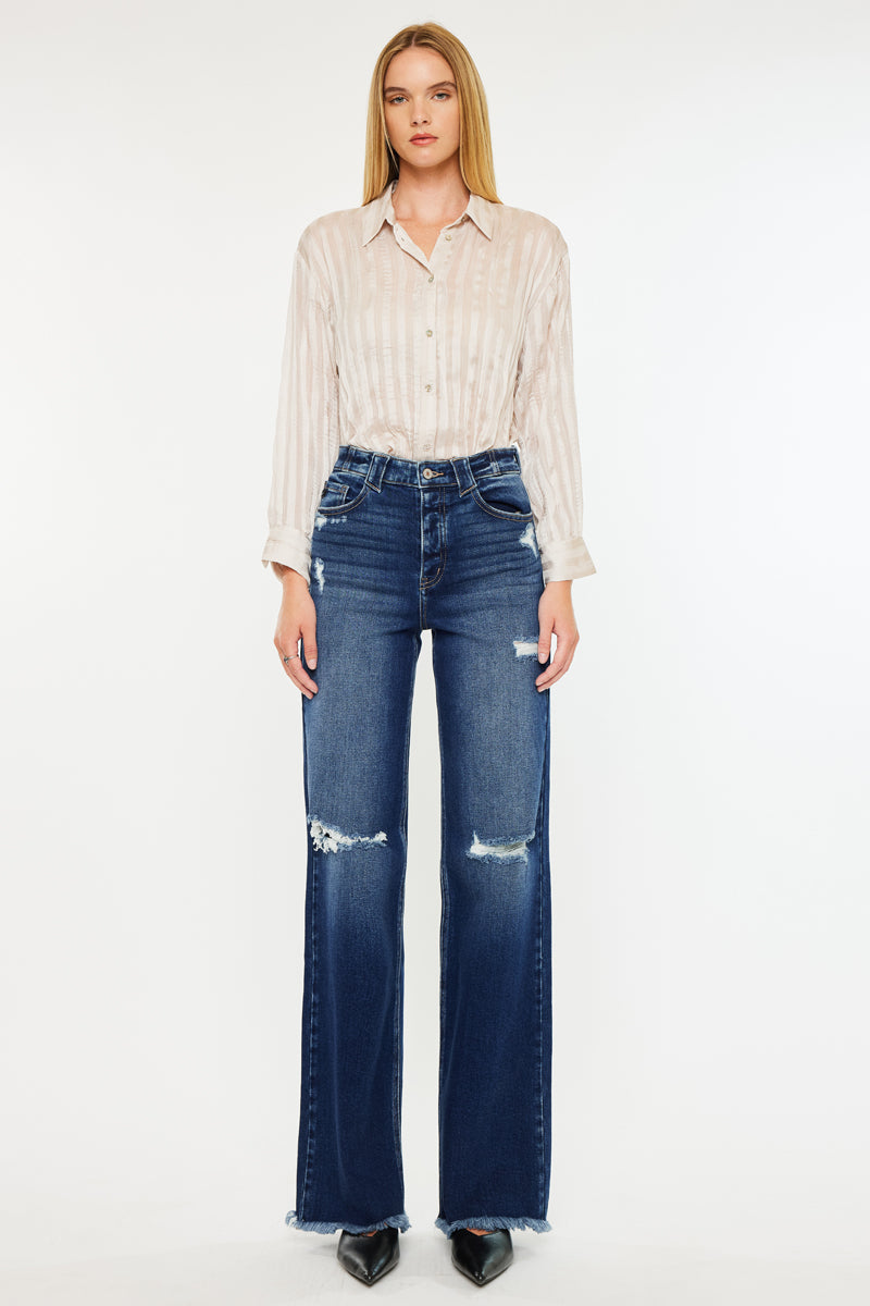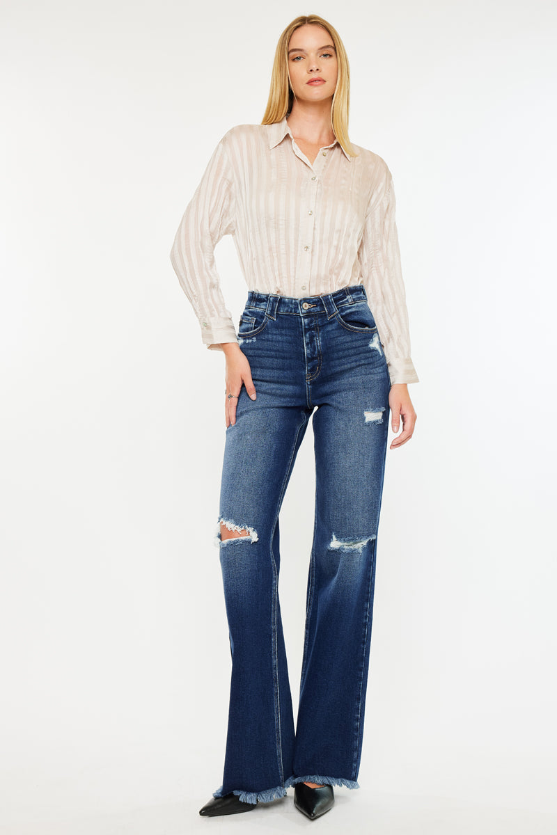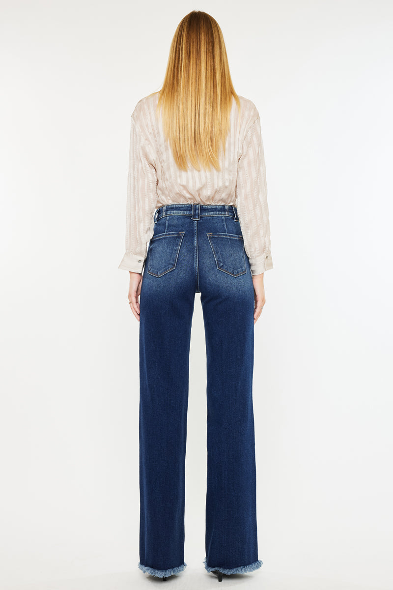 Get in style with our new Izzie High Rise 90's Flare Jeans. In a beautiful Dark Wash color that gives them a sophisticated look. Style them to your liking with thick platform shoes, a cute pointy heel or your everyday sneakers. Featuring a hidden button fly with once visible button, thicker belt loop, a cut seam detail waistband, 5-pocket waistband with a frayed hem.