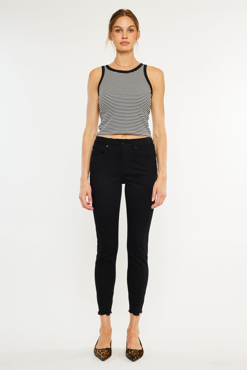 Our May High Rise Jeans come in a classic ankle skinny fit that tapers down the leg accentuating your every curve for a sleek and stylish look. Sits above the natural waistline for a trendy look that elongates the body creating a flattering style. Made with stretch denim with an extra faded wash, distressed hem, and raw hemline for subtle lived-in touch. Features a classic five-pocket design, single-button front, and zip-fly closure.