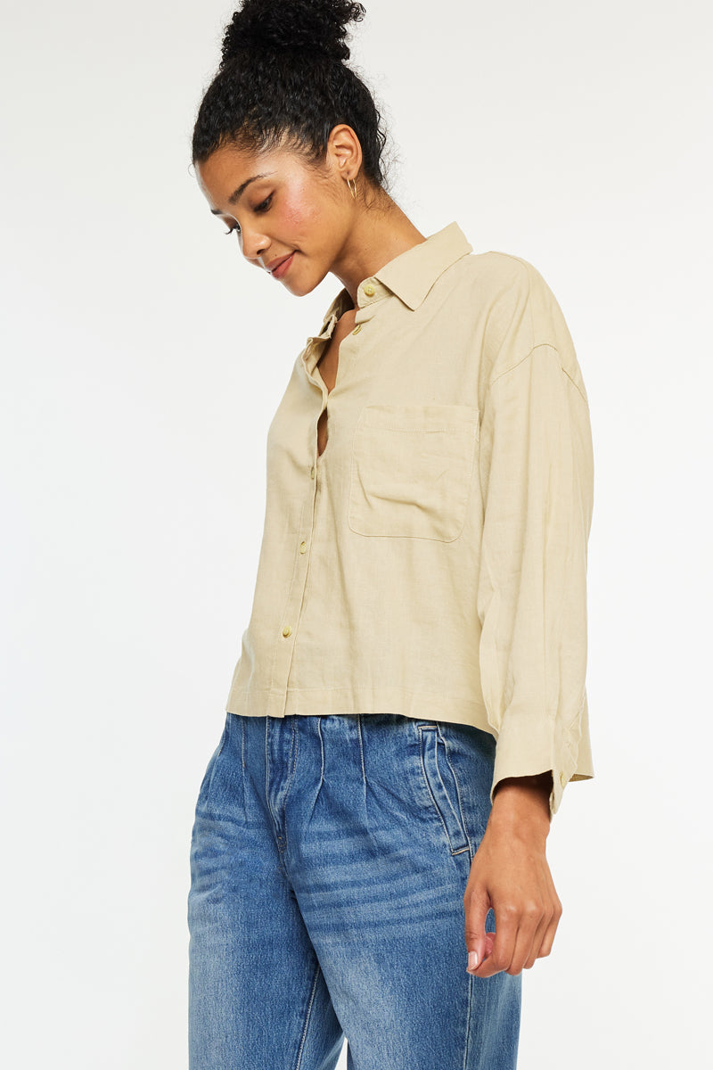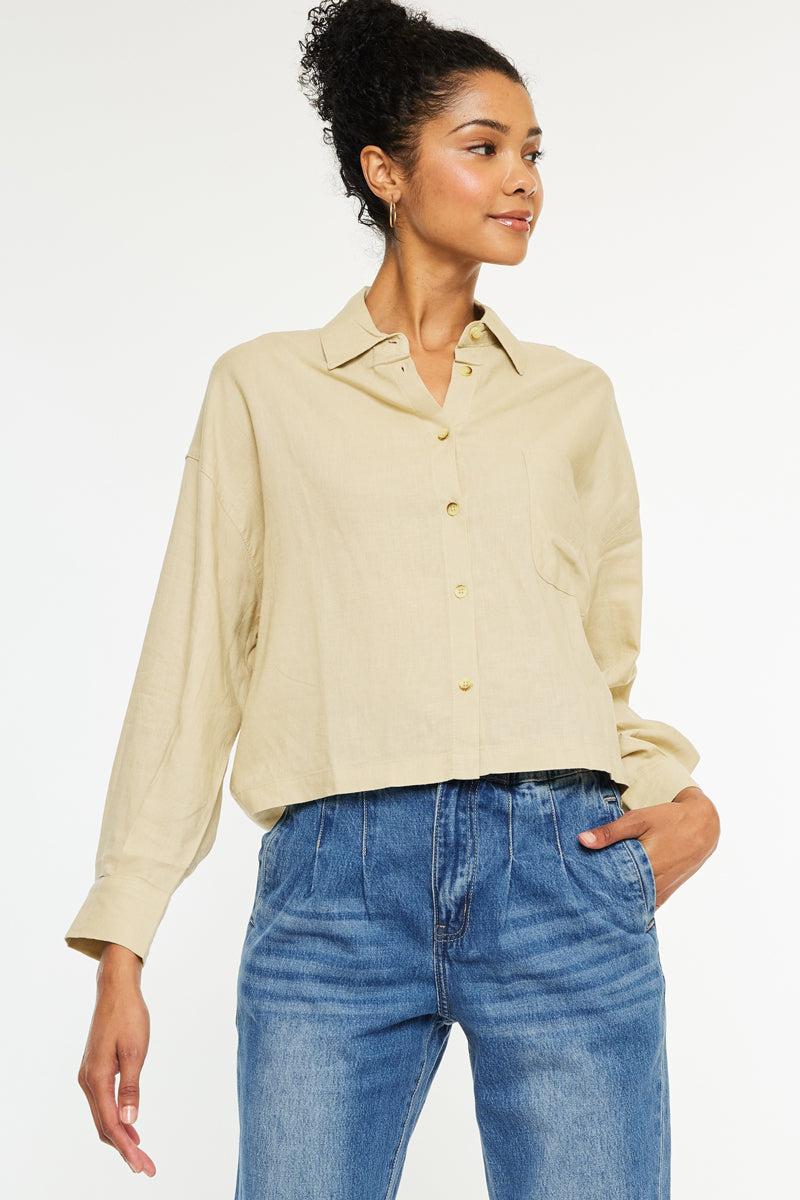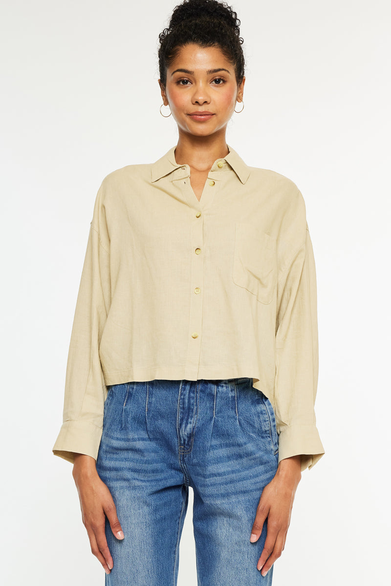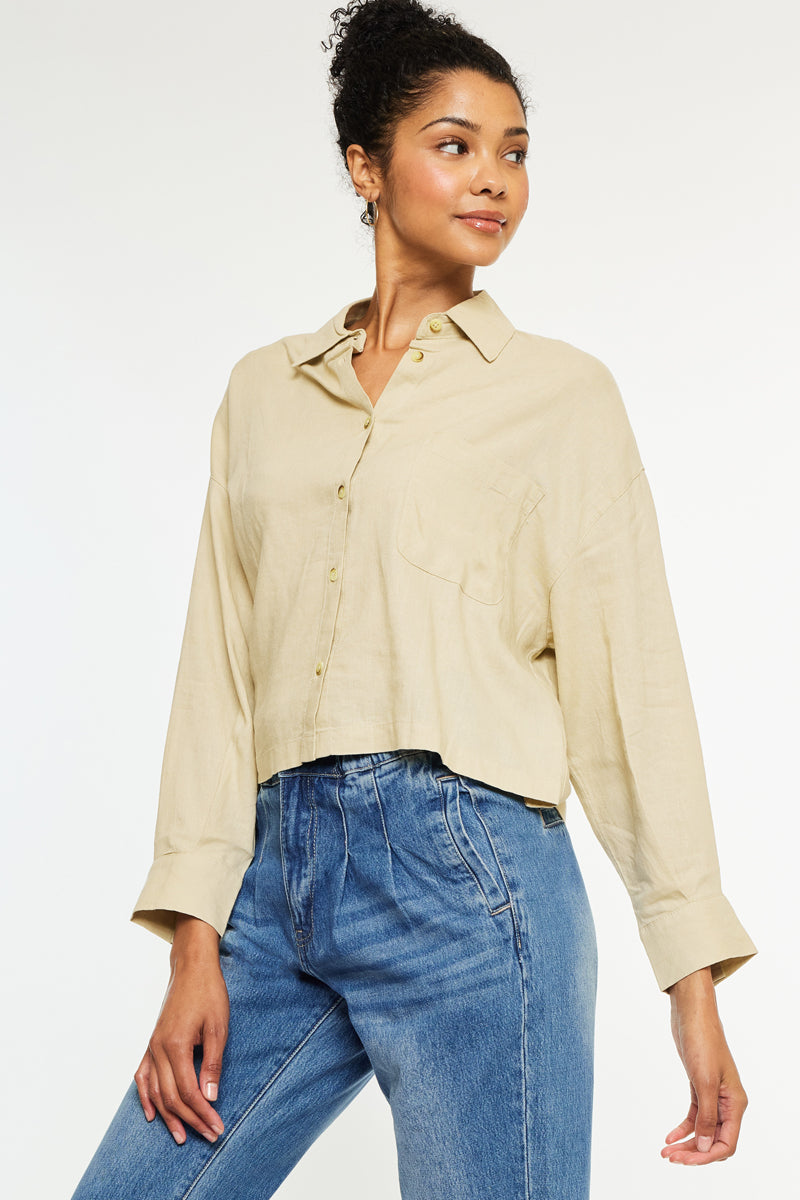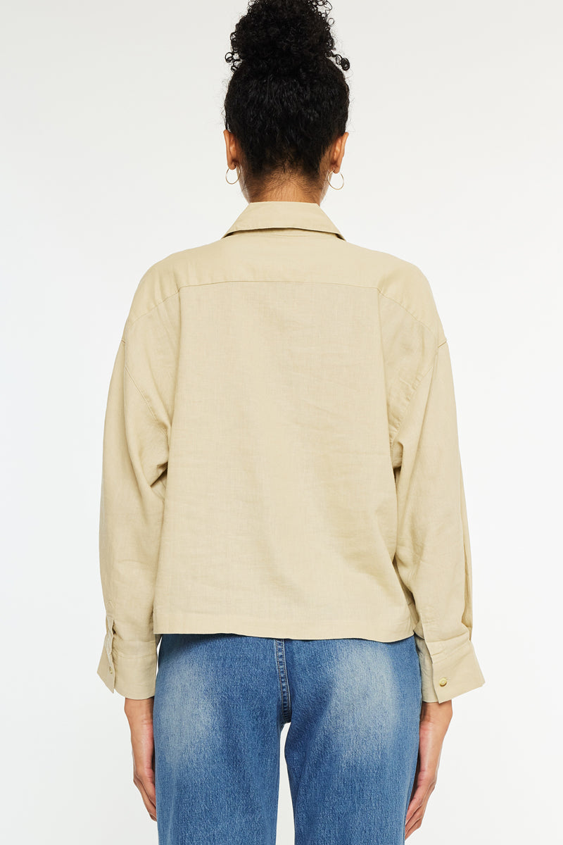 Our Jeeves oversized shirt comes in a thin and lightweight fabric perfect for the spring and summer months that is soft and breathable. Come in a taupe color in a cropped shirt design with a safari look that is trendy and chic. Features a front pocket at the chest, long sleeves that can be easily rolled up, and an exposed button-down closure. This piece will be a classy addition to your closet
