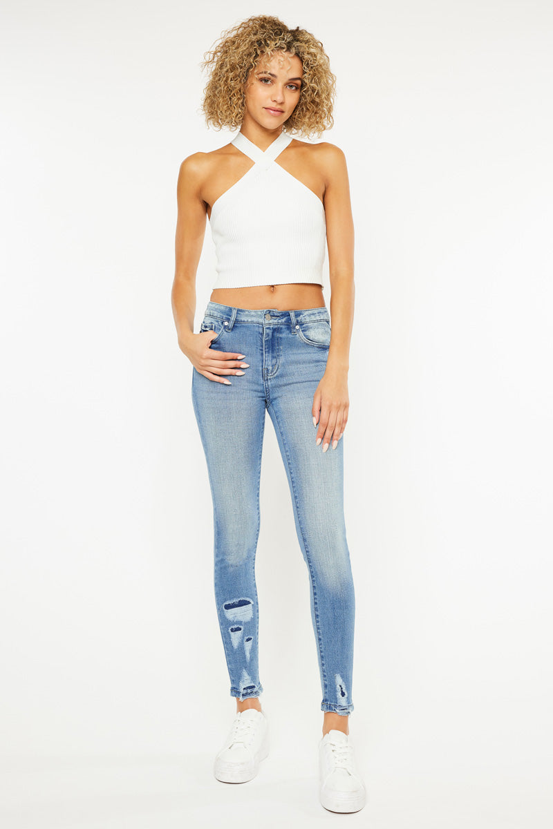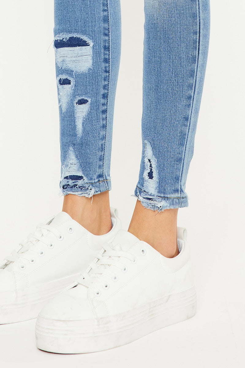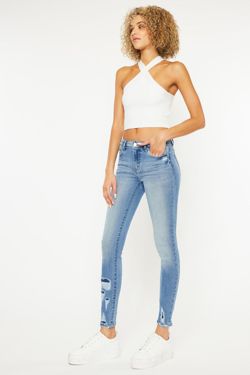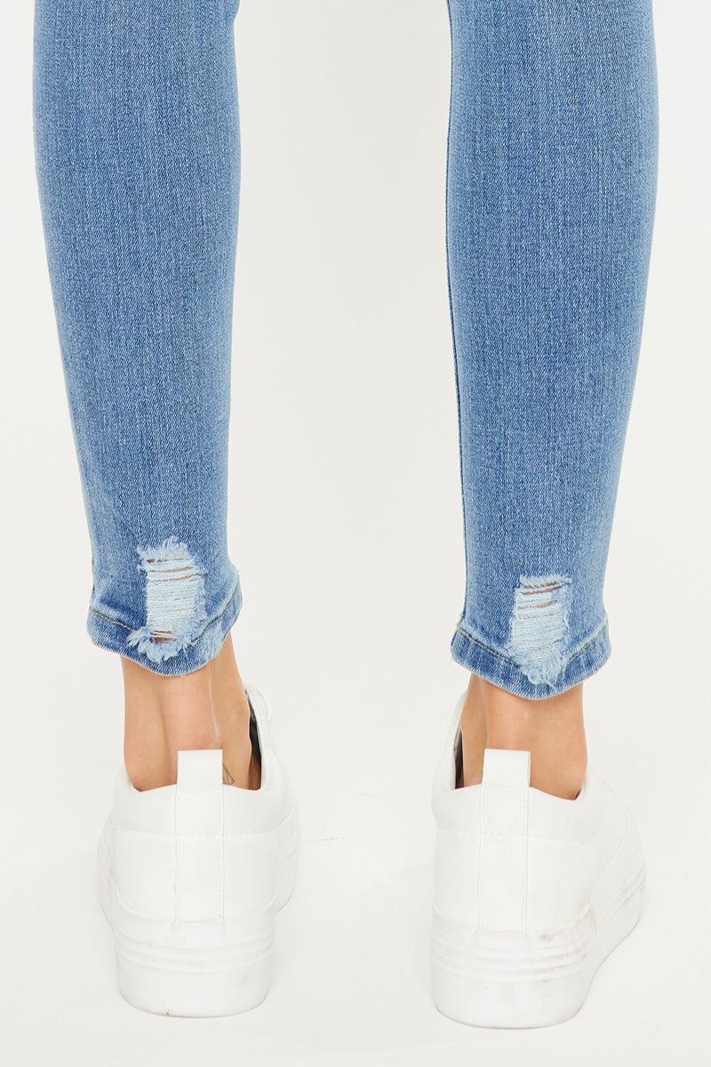 Jenna mid-rise ankle skinny jeans come with distress near the bottom of the jeans and a uniquely designed hem. Faded to perfection on the front and back, its medium wash creates a beautiful blue gradient color. Its whiskering gives this style a more worn-in look, while its stretch allows for comfortable wear all throughout the day.