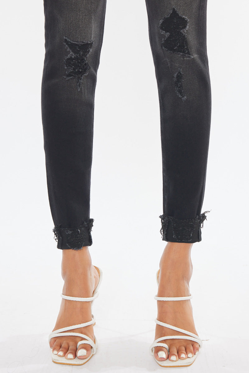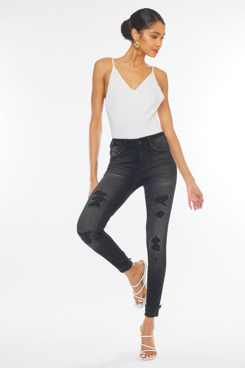Our Jessie Mid Rise Super Skinny Jeans come with major distress with patchwork underneath, along with washed fading on the front and back for a super-lived-in look. Sits right at the natural waistline as it tapers down the leg creating a stylishly sleek fit that contours the body. Made with super-stretch denim that holds its shape while allowing you to move freely with ease. Features a classic five-pocket design, single-button front, and zip-fly closure.