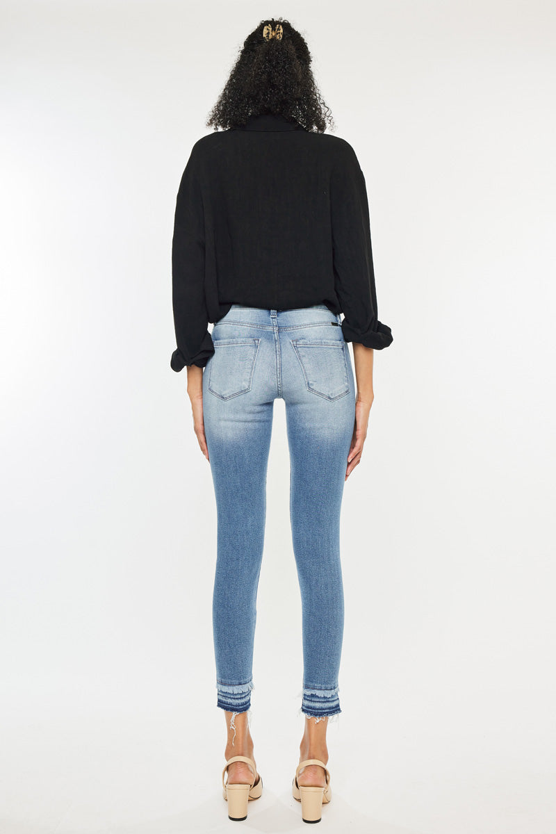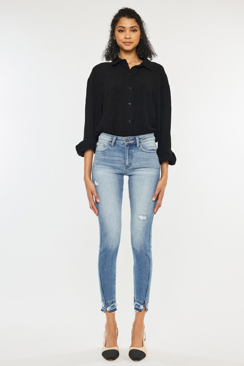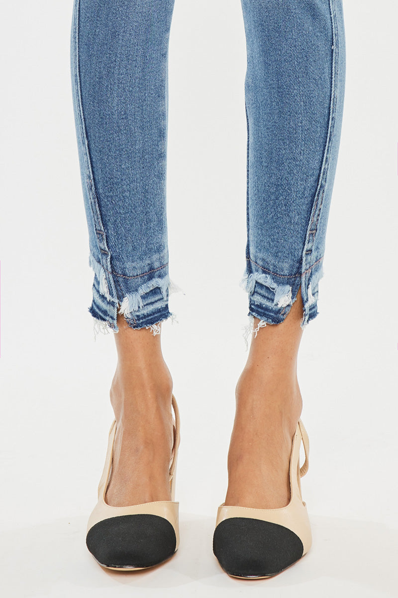 Our Jubilee High Rise Ankle Skinny Jeans comes in a beautiful medium wash with medium fading and light distress detailing. Features a double frayed hem and split bottom inseam.