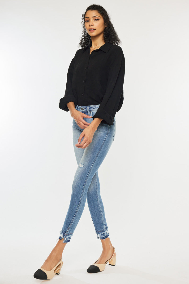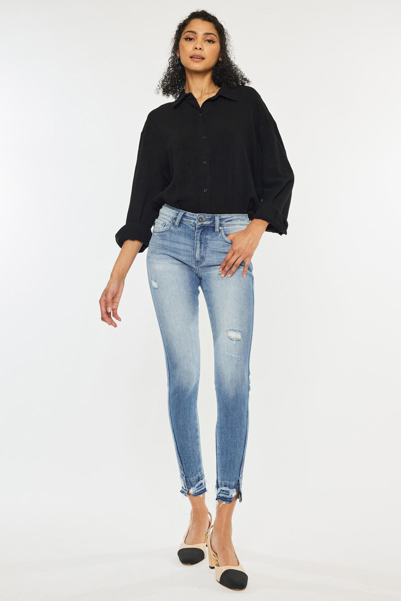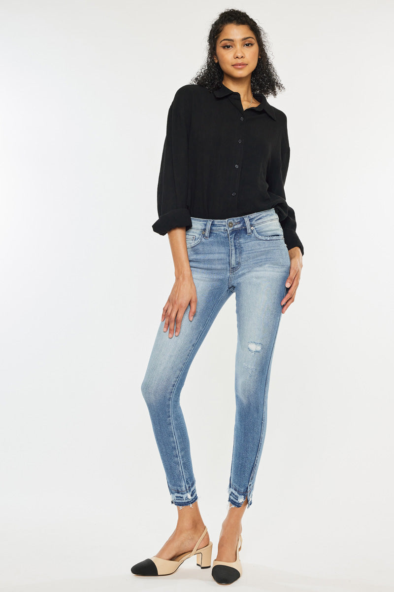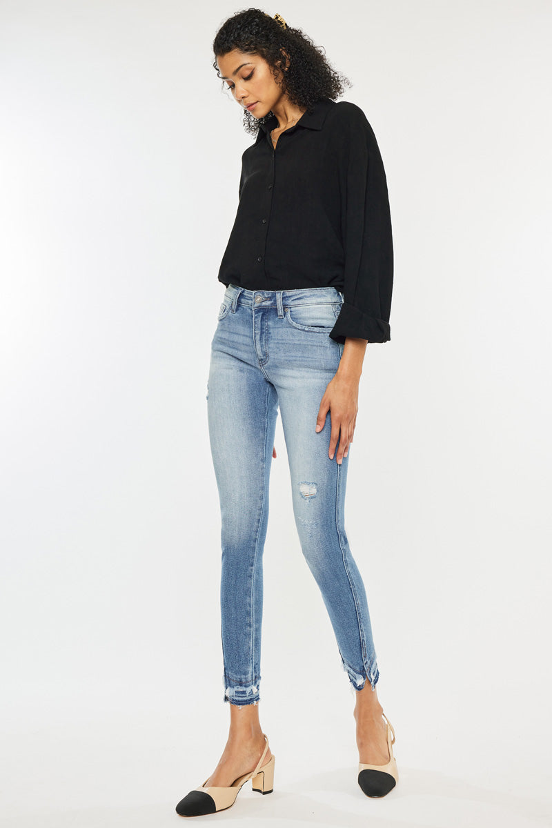 Our Jubilee High Rise Ankle Skinny Jeans comes in a beautiful medium wash with medium fading and light distress detailing. Features a double frayed hem and split bottom inseam.