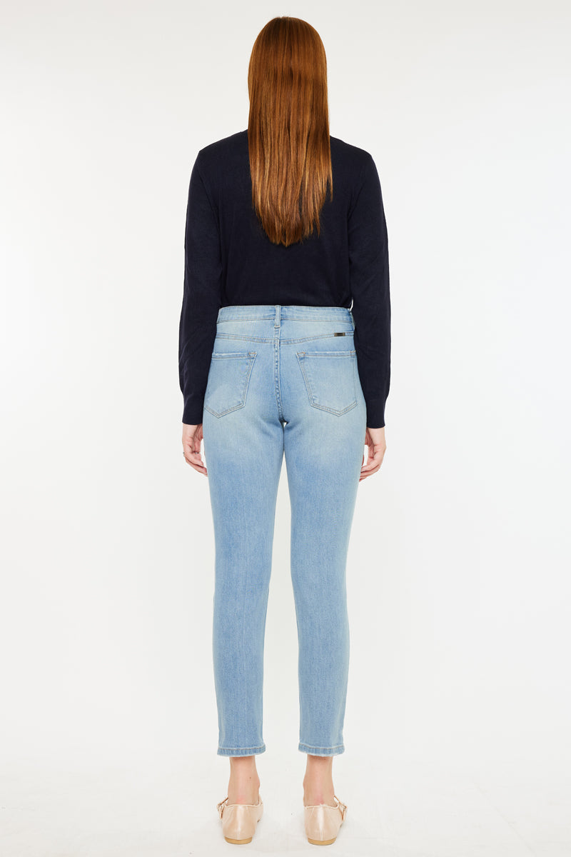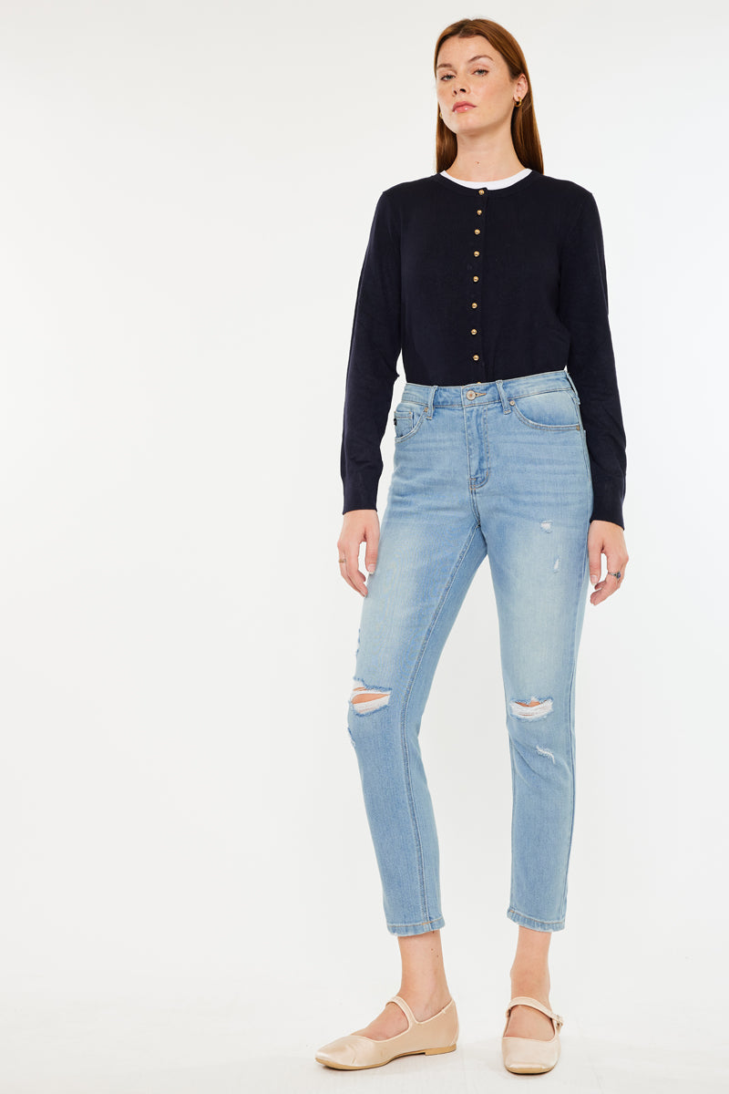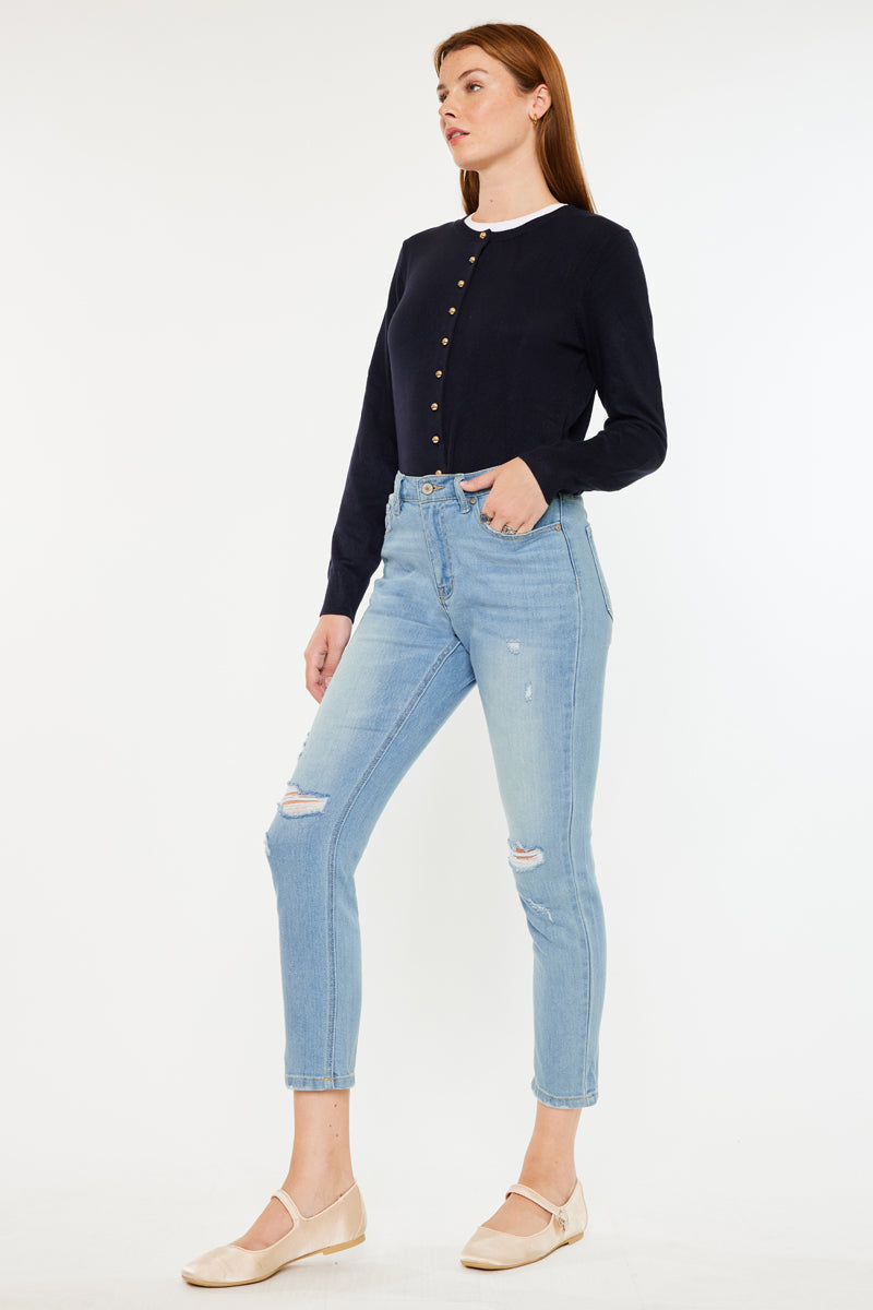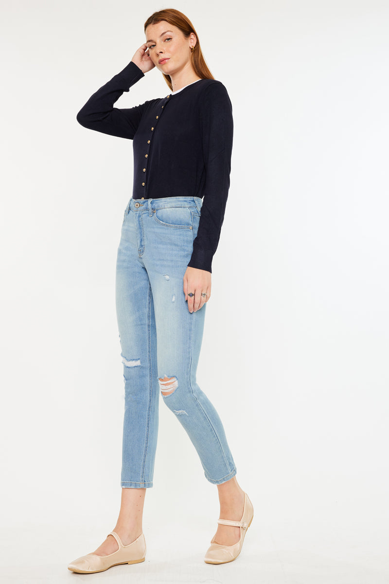 Our Julianne 90's High Rise Skinny Jeans show off your casual yet trendy style. Features knee distress, medium fading, and whiskering for that extra lived-in look. They are made with our comfort stretch denim, making you feel so comfortable all day long. Features a 5-pocket style, front single button closure, and 5-pocket style.