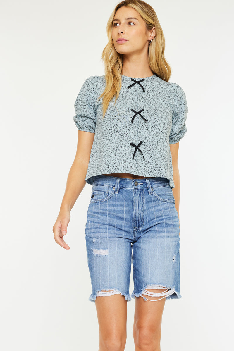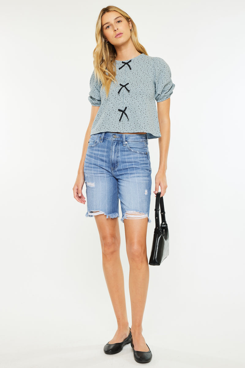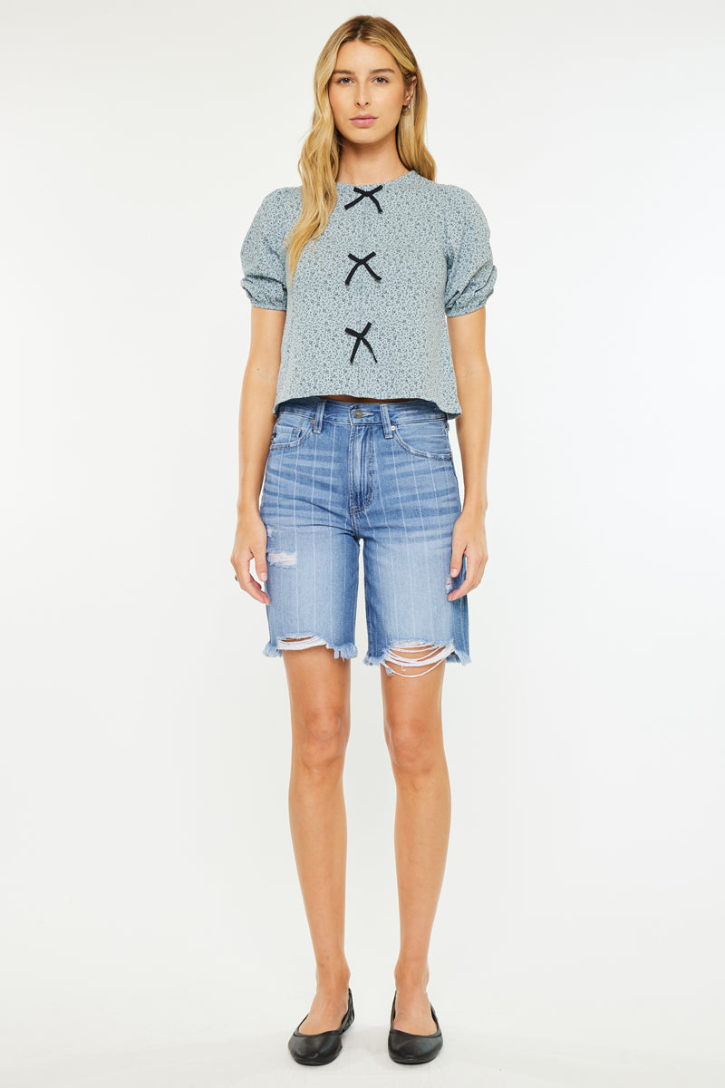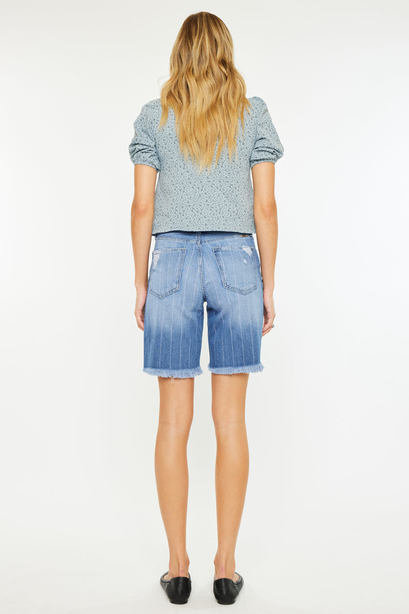 Our Julita High Rise Bermuda Shorts is the perfect way to stay cool in the Summer. This medium-washed denim sits above the natural waistline for a trendy fit that tapers down the thigh and leg. Features medium distress, light fading, and light whiskering. Made with super-stretch denim that allows you to move freely with ease as it reverts to its natural fit after each wear.