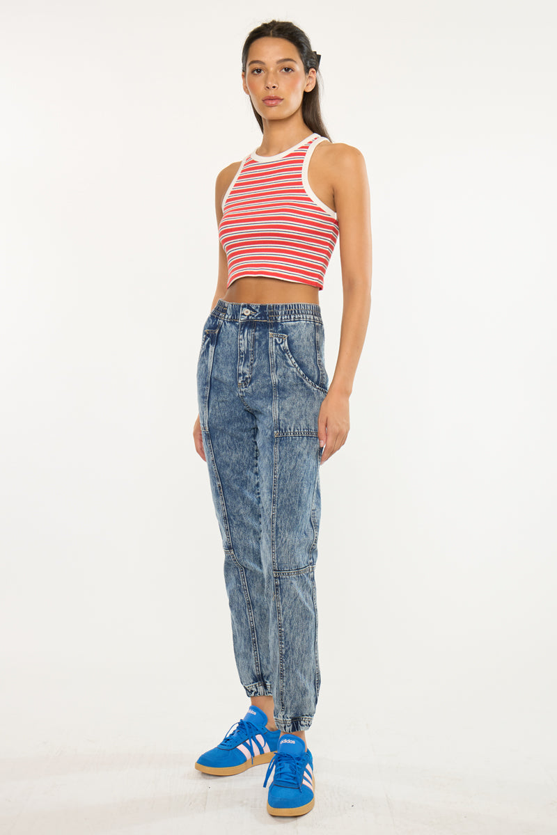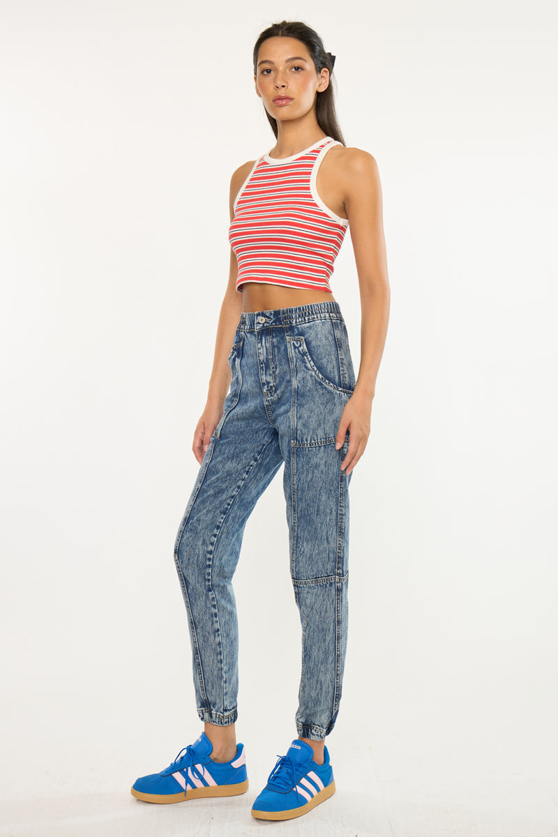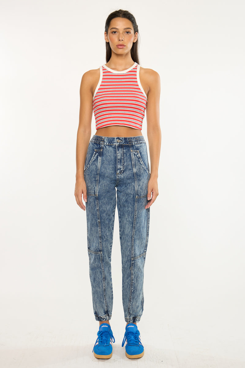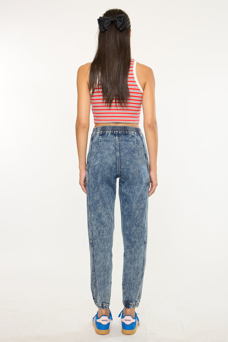 Our Kaios Ultra High Rise Jogger features an elastic waistband and elastic scrunch hem that creates a look that's both casual and chic. Sits high above the natural waistline as it relaxes down the leg and finishes at the ankle. The stitch detail on this goes above and beyond giving this acid wash denim an edge that brings this jogger to the next level.
