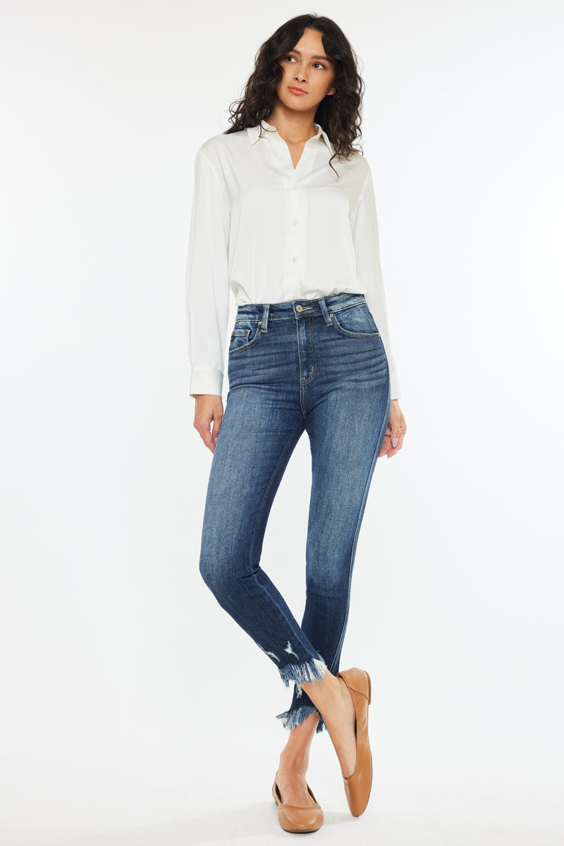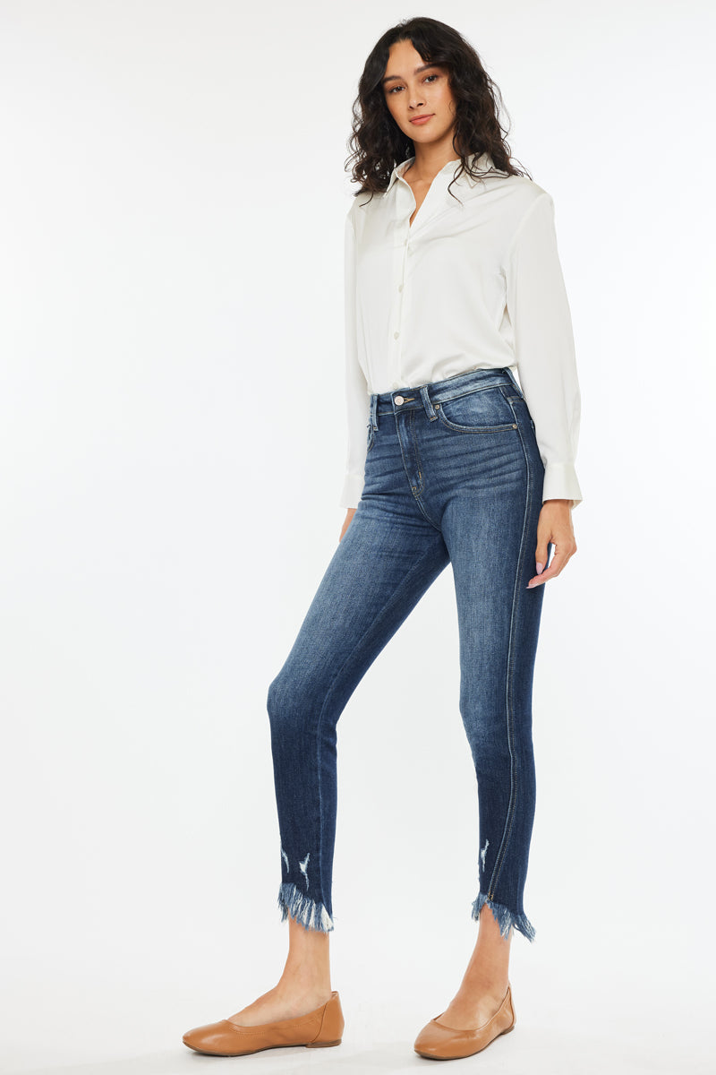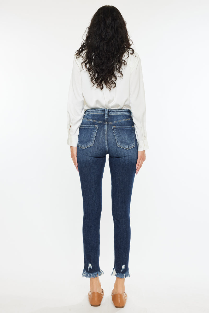 Our Kamala High Rise Ankle Skinny Jeans are the perfect addition to your wardrobe. These high-rise ankle skinny jeans come in a dark wash with whiskering and fading details. Sits right above the waist line and hugs your hips while featuring a skinny leg throughout. For an extra edge, these skinny jeans have a twist-out seam and frayed hem for an extra edge. Features a single front button closure, 5 pocket style, and zip fly.
