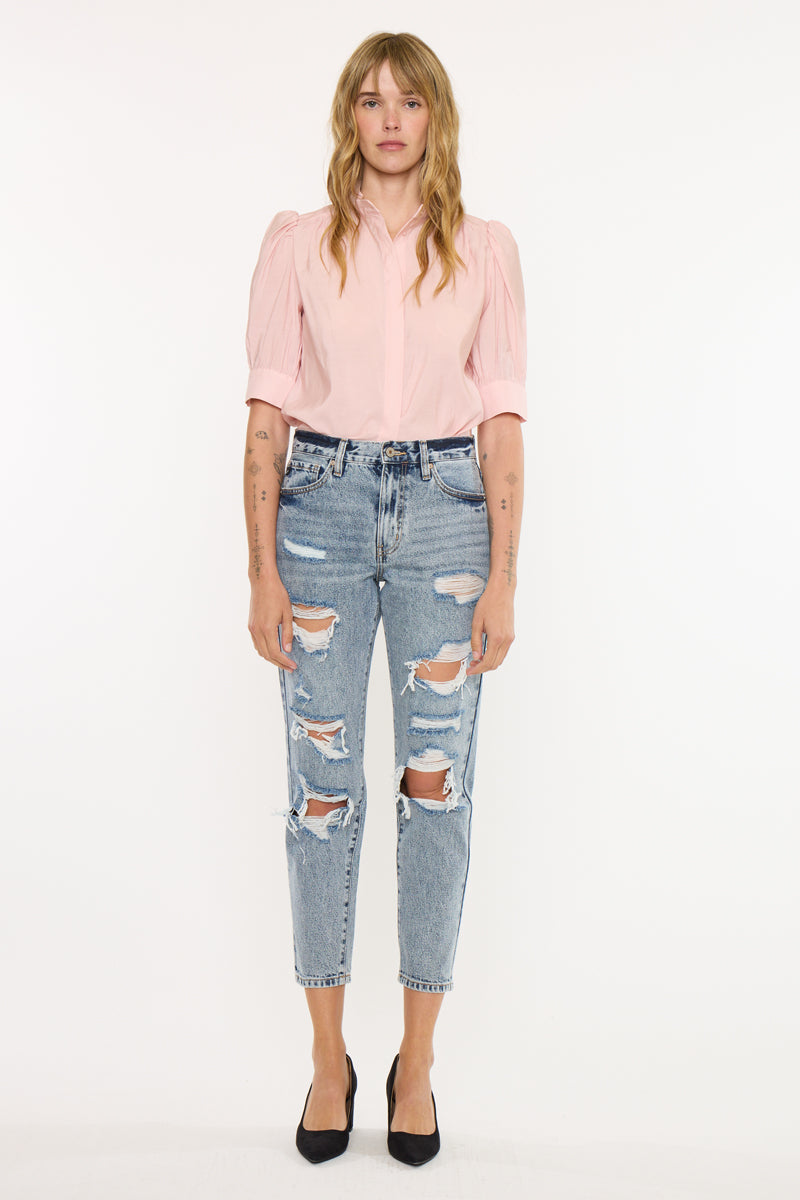 Karen Ultra High Rise Mom in a Medium, washed, relaxed fit, non-stretch, featuring an easy tapered fit, heavy distressing detail, mild fading, and whiskering. This jean is modern and trendy, and it can be worn with flats or heels. Features a classic 5 pocket design, single-button front closure, and zip fly.