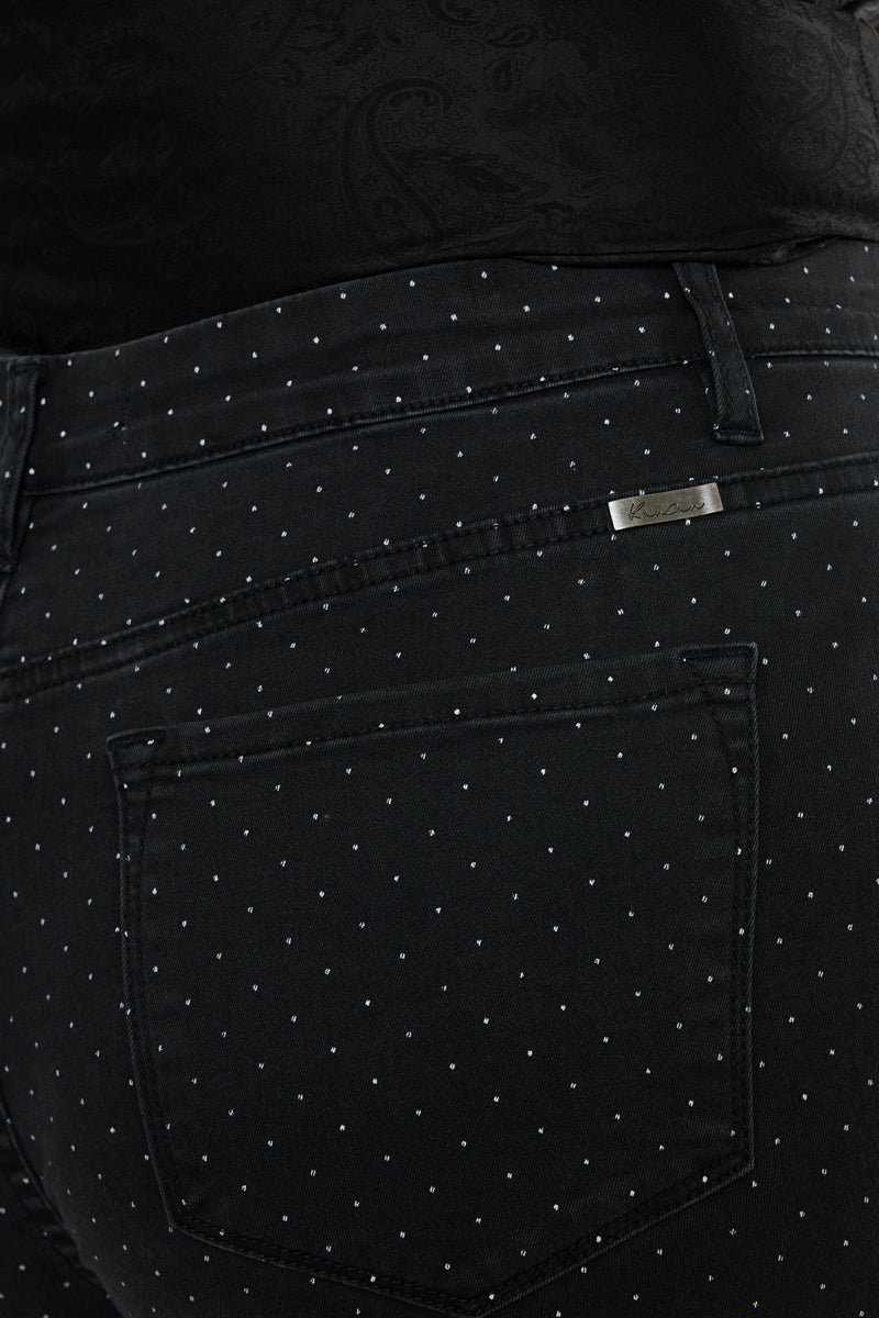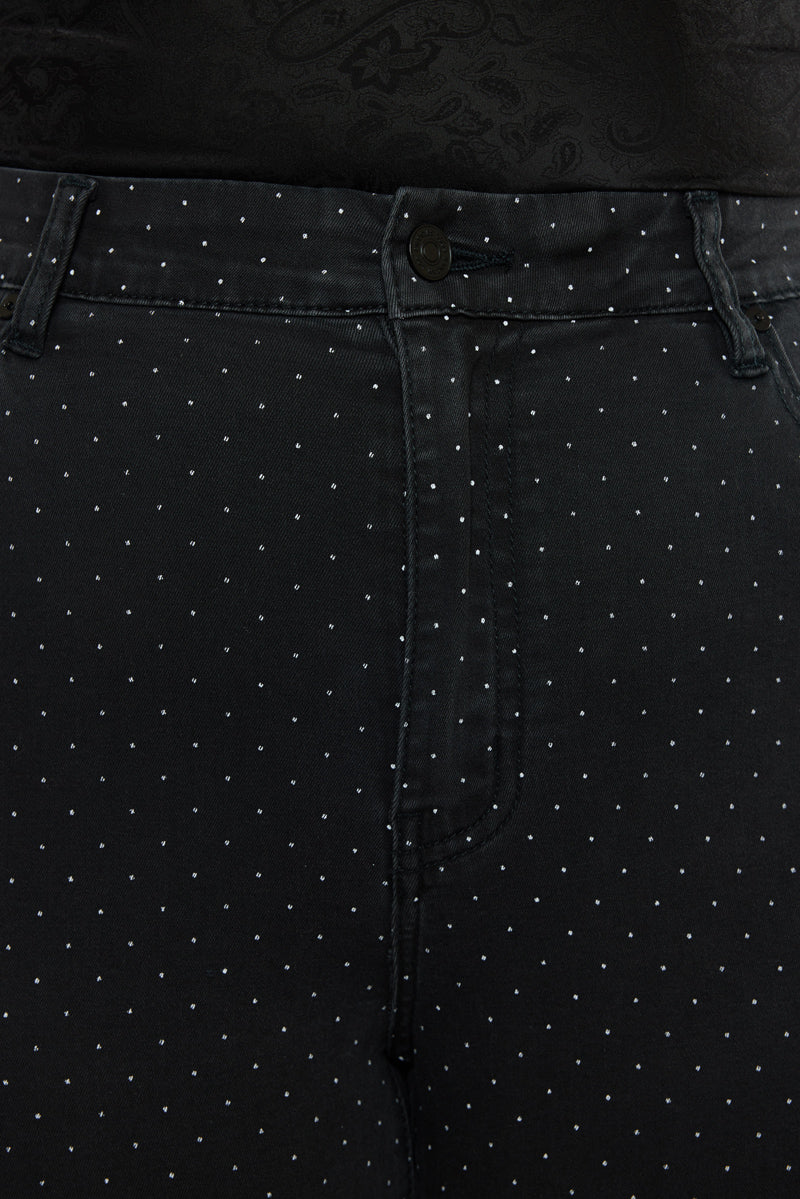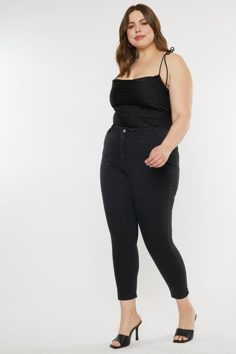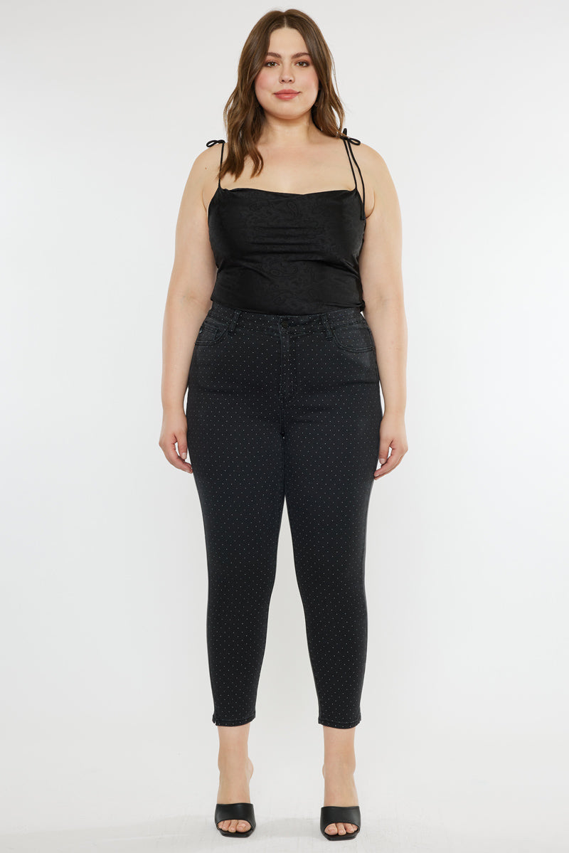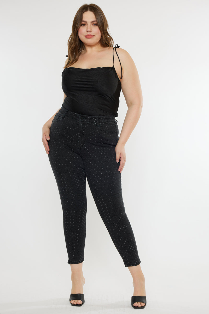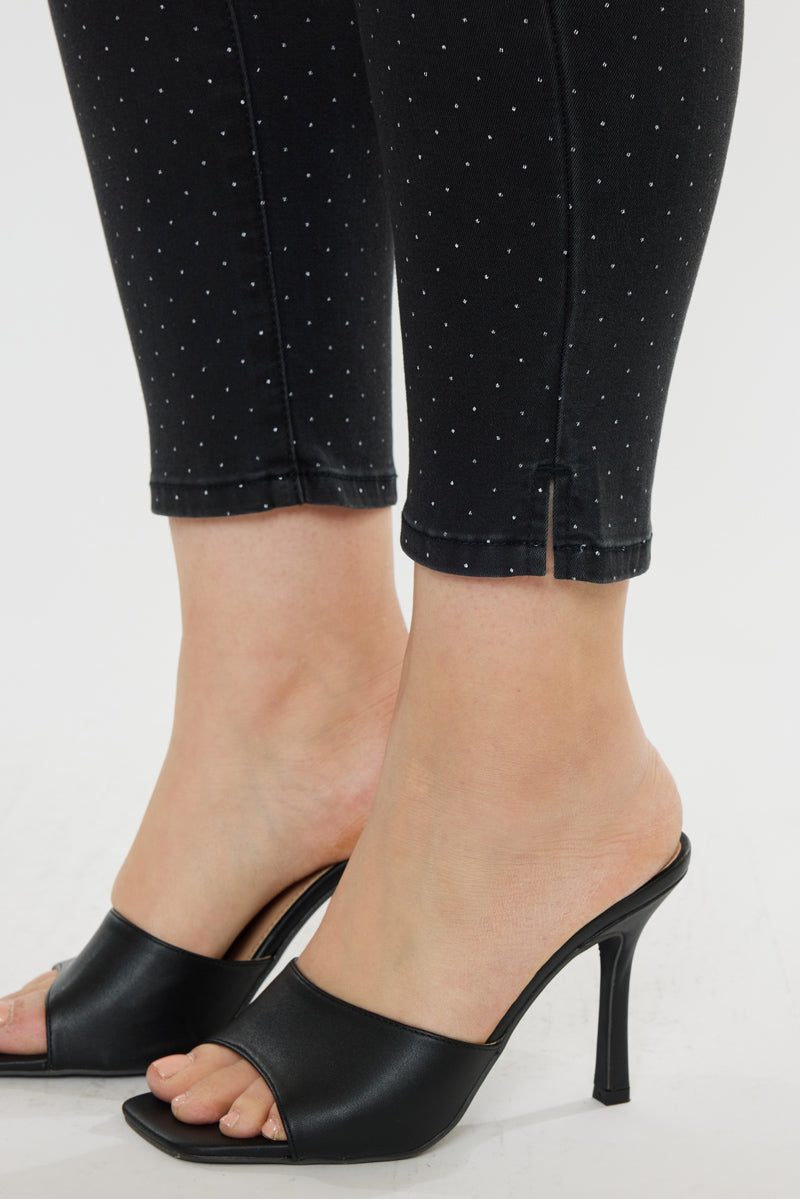 This high-rise ankle skinny jean features a fun polka dot design, side slits at them, and a gently dark grey faded wash. Styled to accentuate every curve of your body, we know you'll stand out no matter what you pair these jeans with.