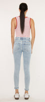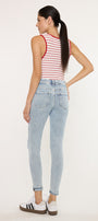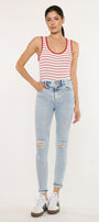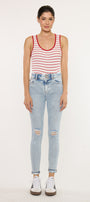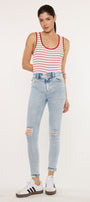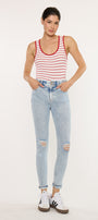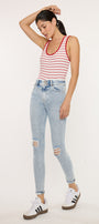 Expand your style into sweet streetwear with this pair of skinny jeans featuring a high-rise waistline, double button closures with zip fly, an acid wash color, contrast stitching, distressed detailing throughout, and a 5-pocket design.