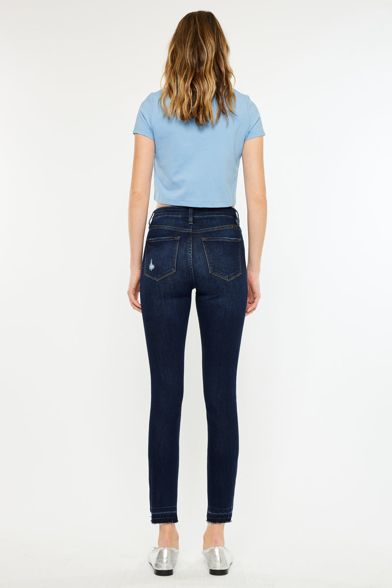 Clean crisp dark flattering fit cropped length skinny featuring staggered hem with subtle distressed detail. Perfect for the warm seasons.