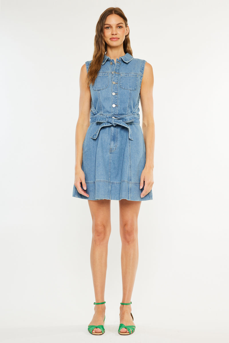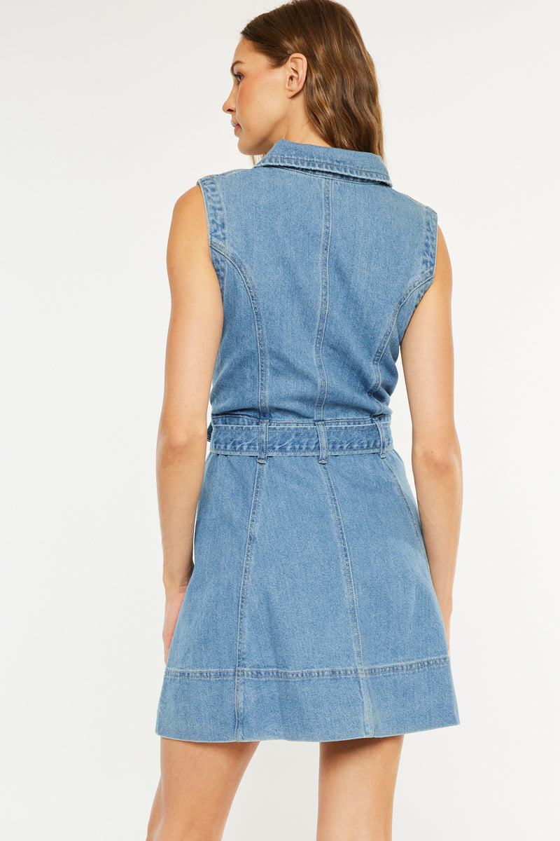 A cute mini dress for any occasion, a picnic date with your significant other or brunch with your friends. Sleeveless with a collar and seam details. Button down front with a zipper closure and a self-waist tie. Made true to size.