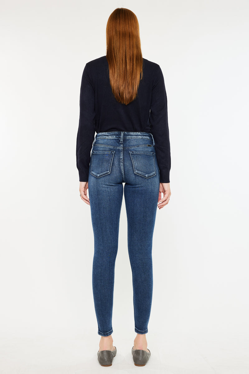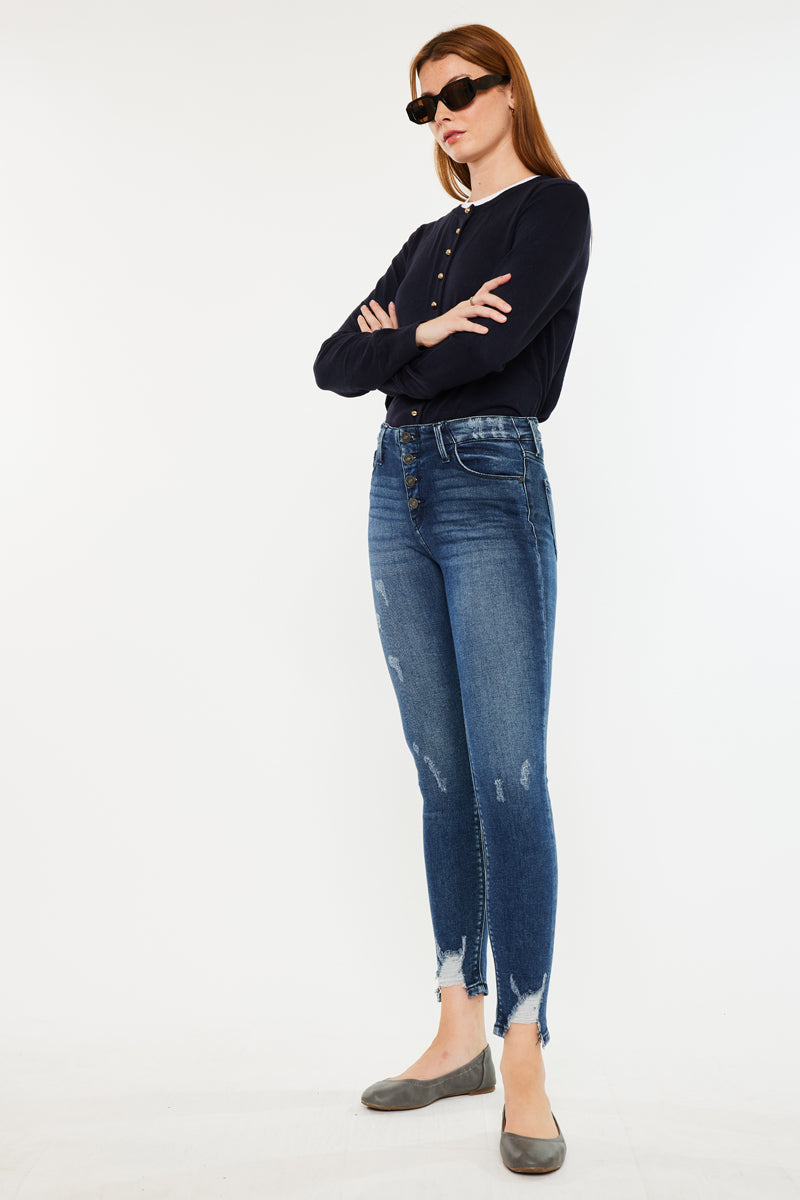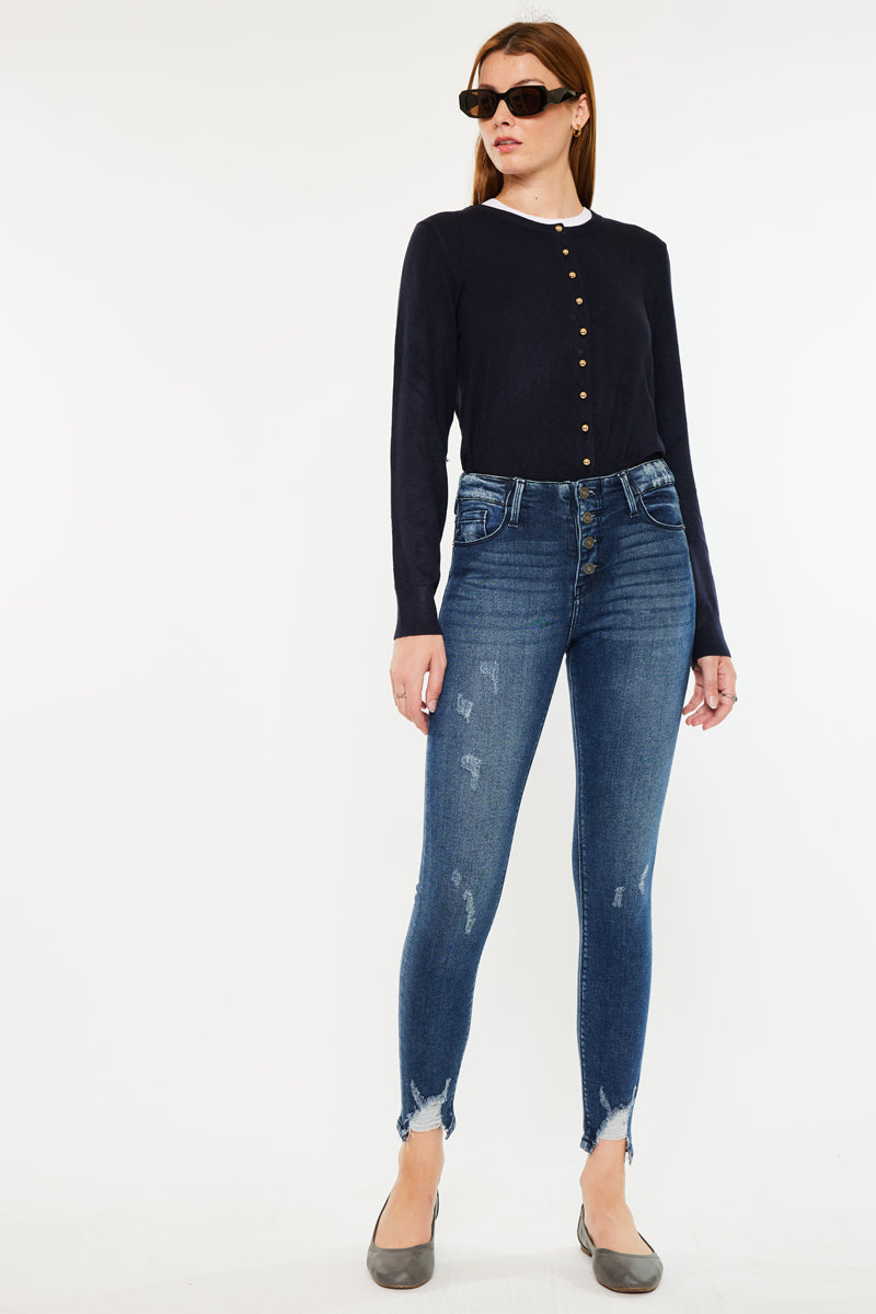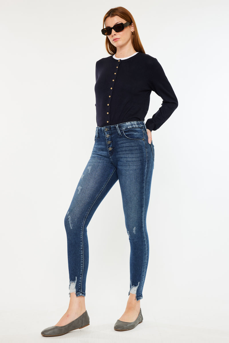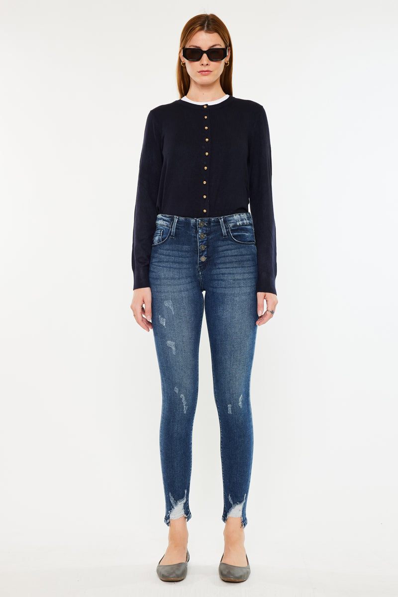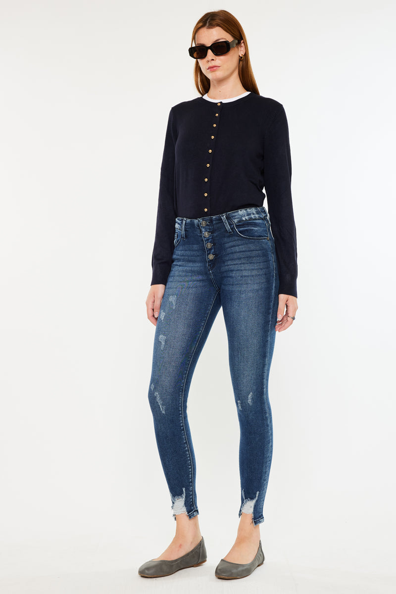 Our Kirby High Rise Super Skinny Jeans are the ultimate skinny jeans for your next outfit. These dark wash skinny jeans have light distress, light fading, and whiskering. Sits above the natural waistline as it tapers down the leg creating a sleek silhouette that contours your body. Features a cut seam detail, classic five-pocket design, and 4-button front closure.