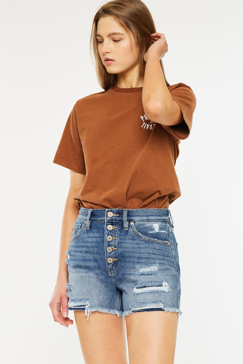 Our Krissy Ultra high-rise mom shorts gives an edgy vibe that's perfect for everyday wear. Pairs best with casual tees or crop tops meant for a comfortably chic look. Featuring whiskering, fading, distressed details throughout, frayed hem, 5-pocket design, and a five-button front closure.
