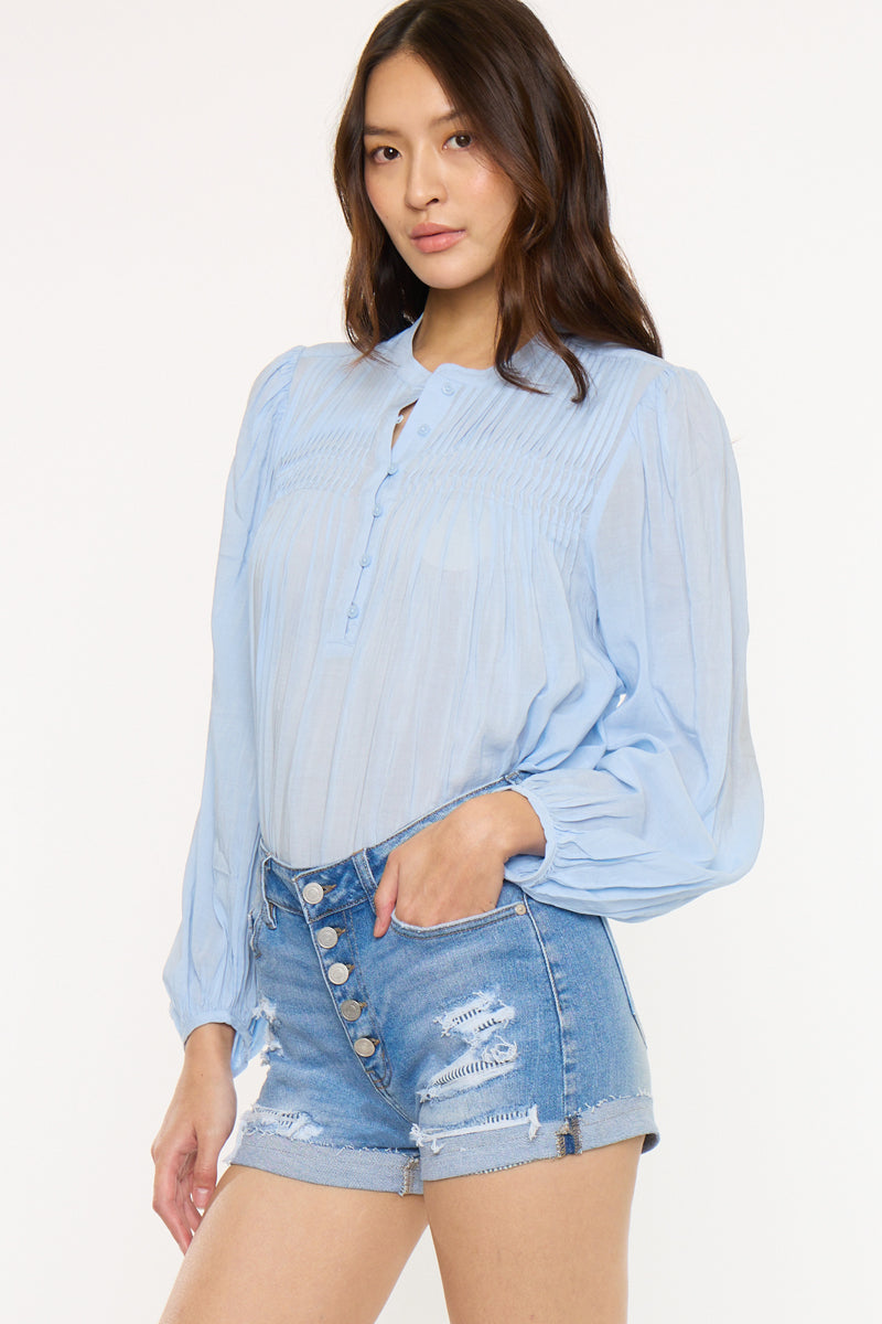 Our Krista High Rise Shorts come in a medium and dark blue wash with slight fading on the front with heavily distressed details with striped patches underneath with folded raw hem. It sits right above the waist for an on-trend look that accentuates the waistline and elongates the body. Perfect for summer beach days or lounging around at home!