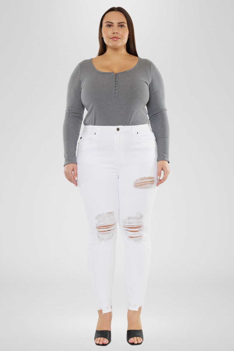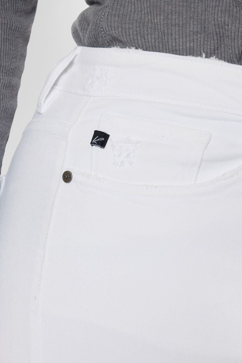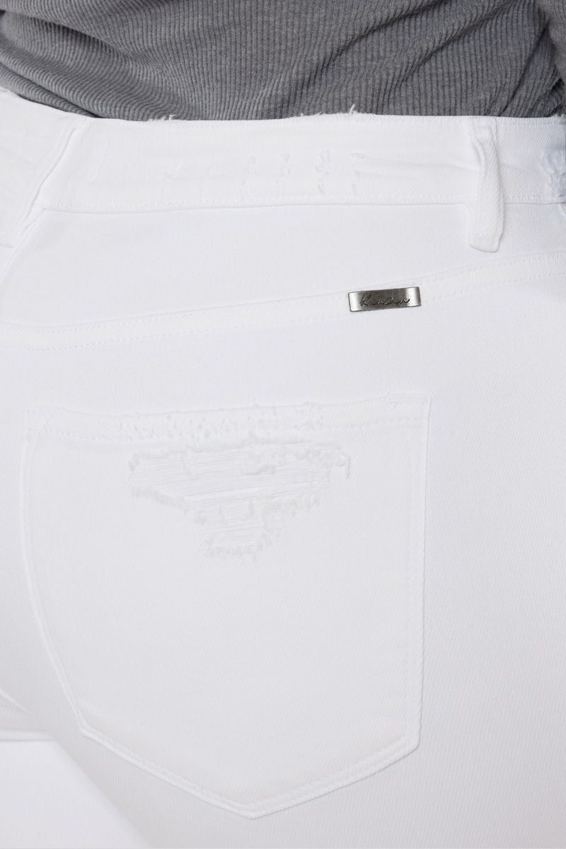 Our Kristy High Rise Slim Straight Jeans is a white color pair of denim that is perfect for your next night out! Featuring distressed detailing at the knees and left thigh, single-button zip fly closures, and a high-rise waistline to flatter your figure.