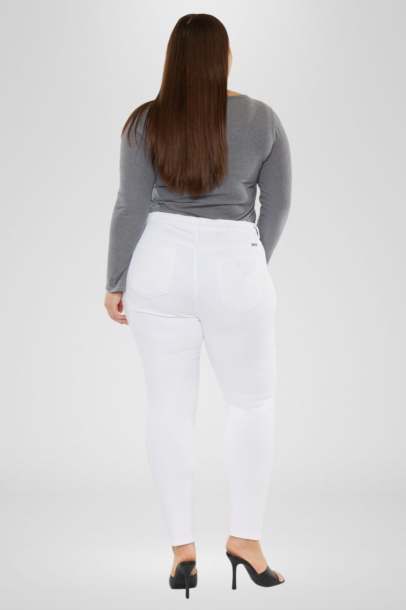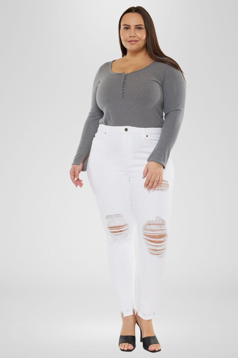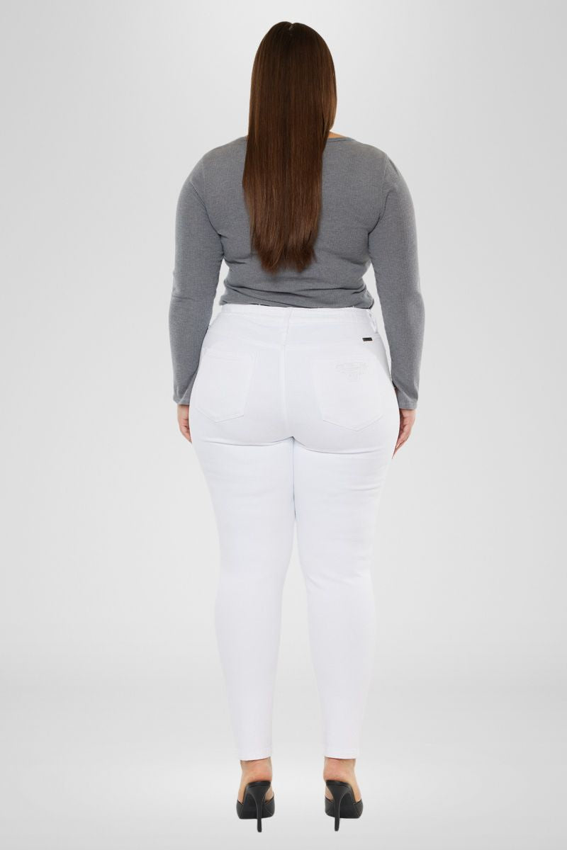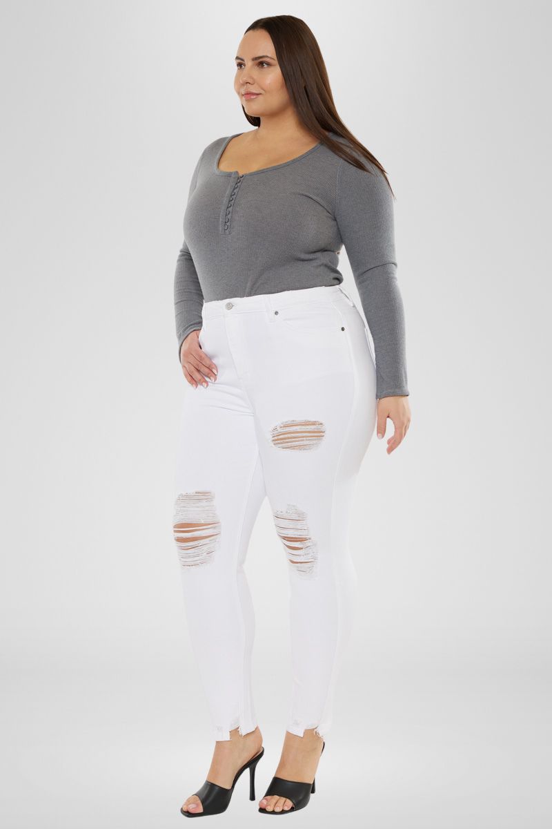 Our Kristy High Rise Slim Straight Jeans is a white color pair of denim that is perfect for your next night out! Featuring distressed detailing at the knees and left thigh, single-button zip fly closures, and a high-rise waistline to flatter your figure.