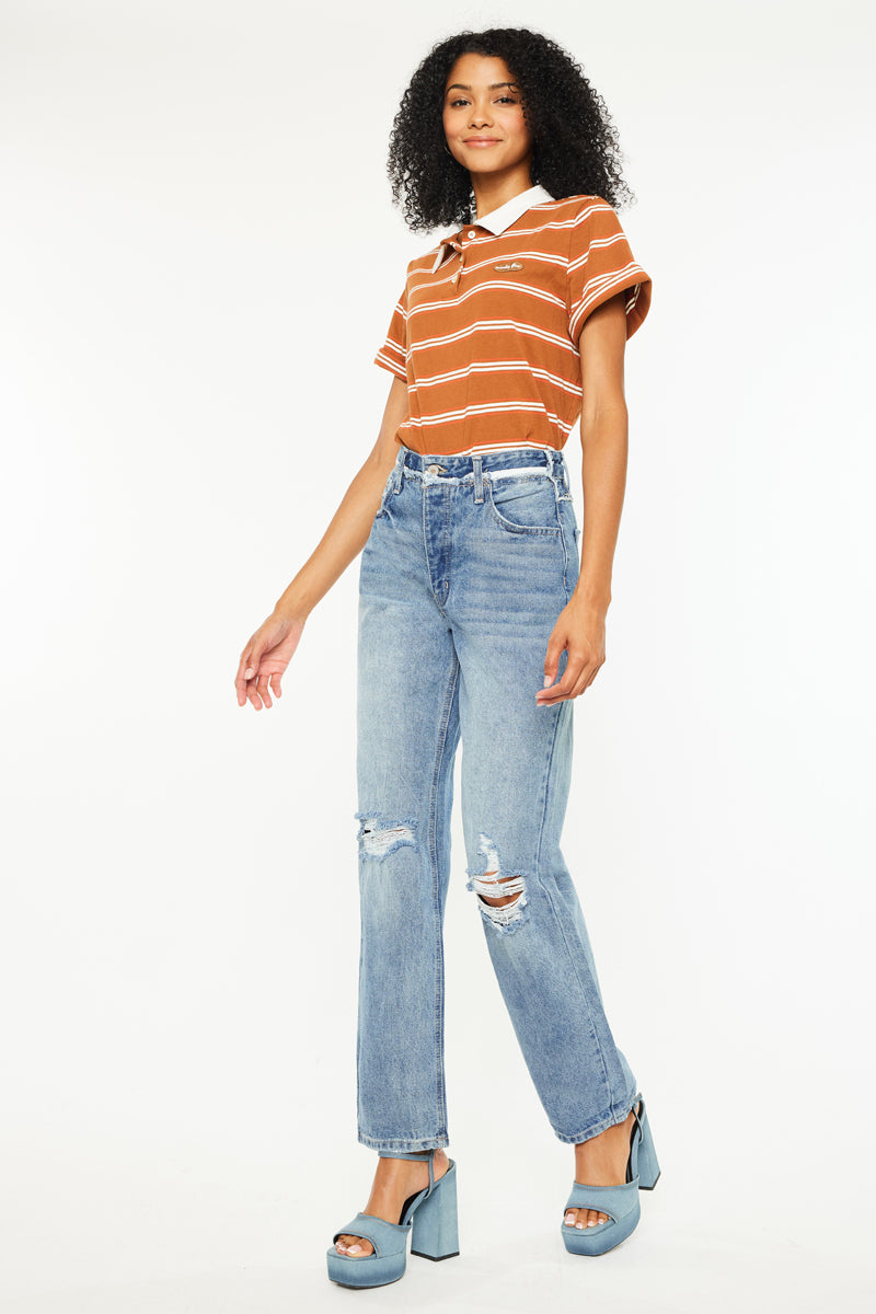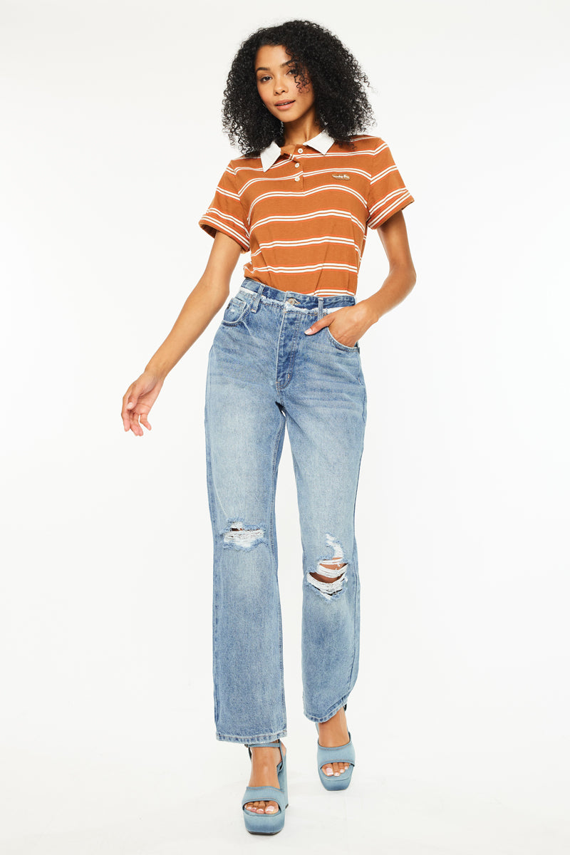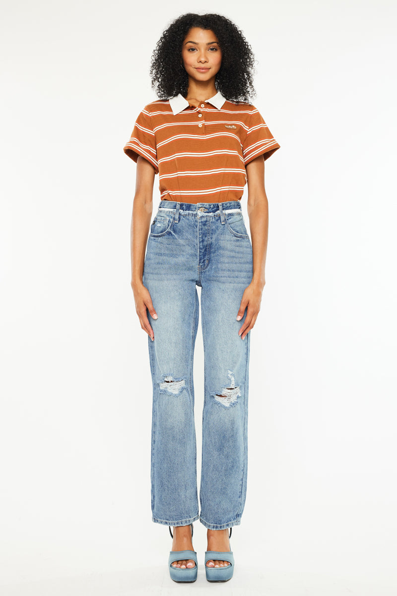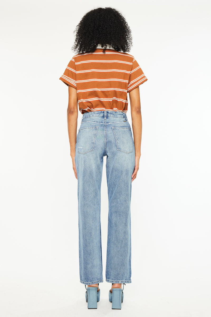 Our Laila High Rise 90's Straight Leg Jeans are perfect for your everyday casual day wear. It is easy to dress up or down with its easy-to-style medium wash color and light fading for that lived-in look. Features light distress over the knees, 5 pocket style, and raw detailing at the waistband.