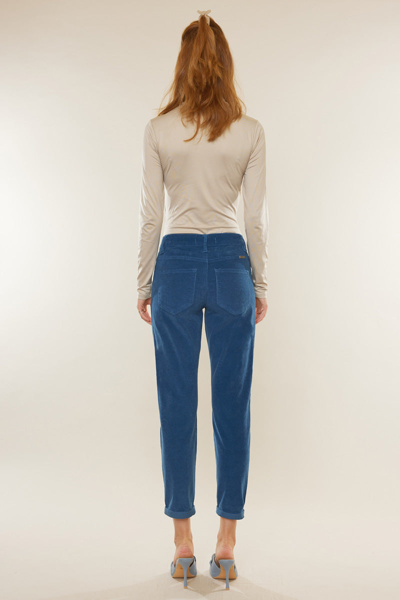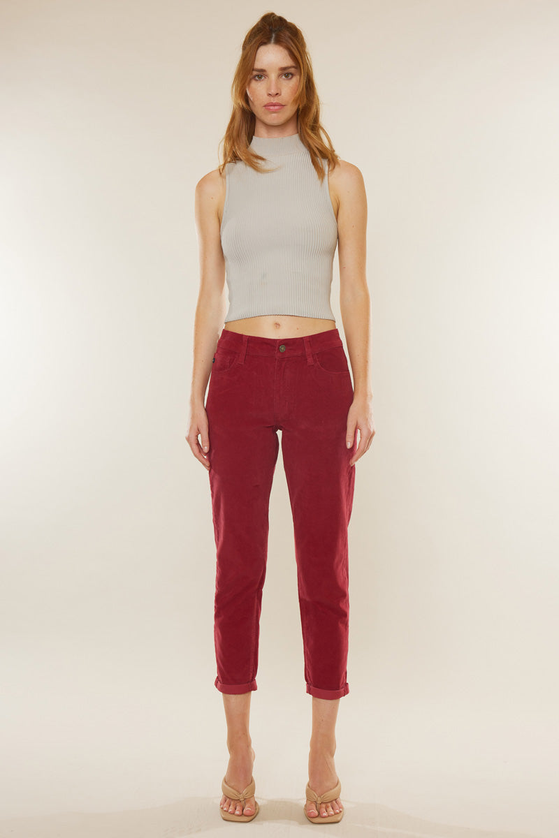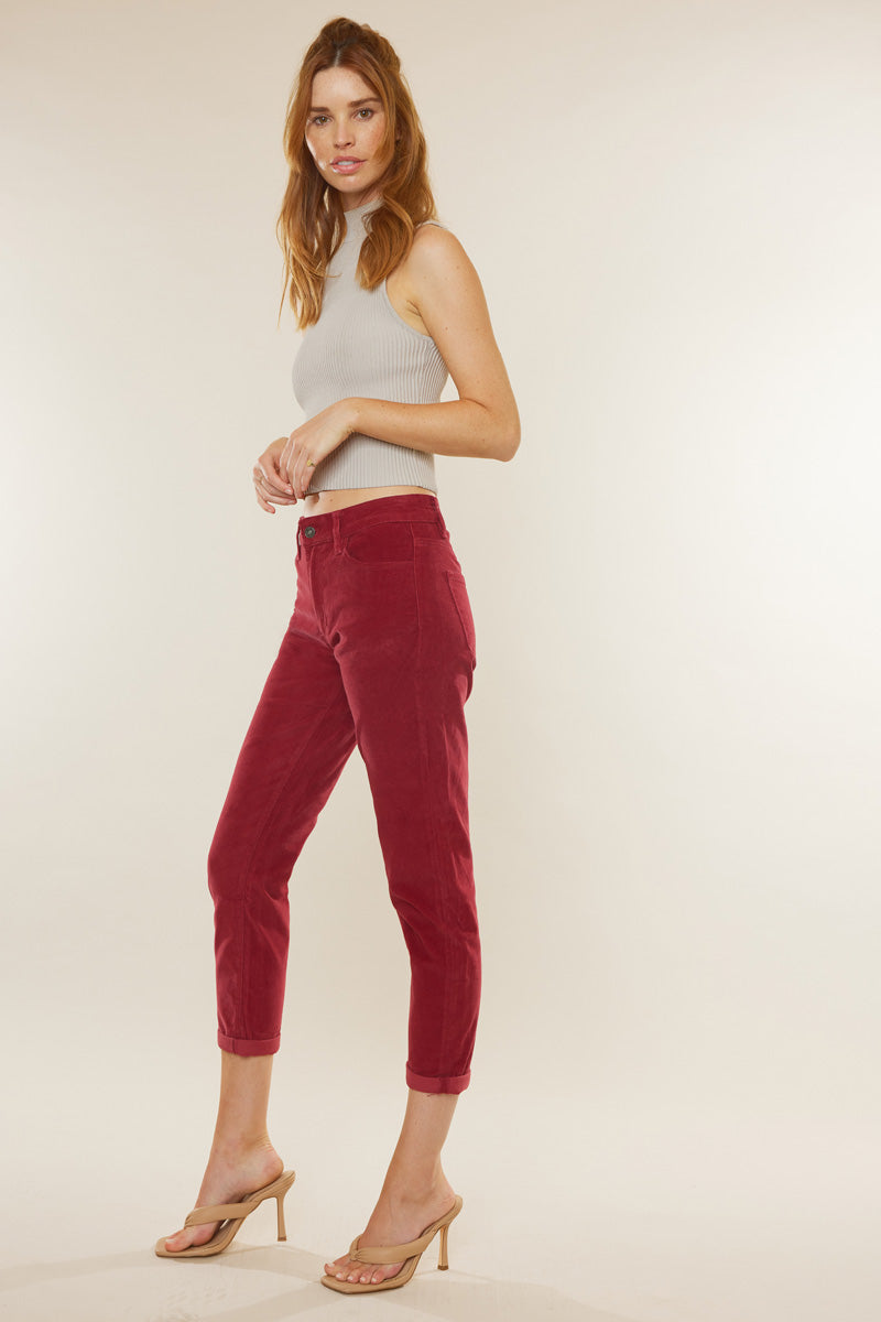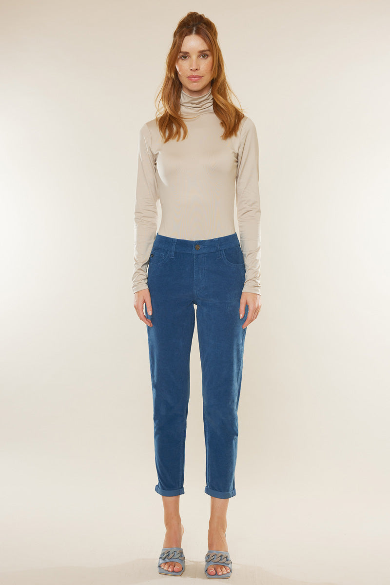 Our Leah High Rise Corduroy Mom Jeans come in a classic mom fit in both an aqua blue and red color. Sits above the natural waistline as they relax down the leg for a comfortable fit that's chic and trendy. Made with velvety soft corduroy fabric that's fitted for a tailored look that'll never go out of style. Features a classic five-pocket design, single-button front, and a zip-fly closure.