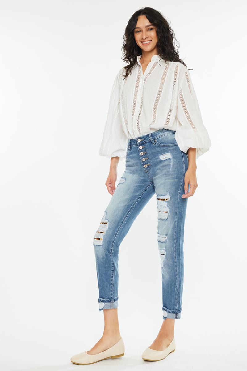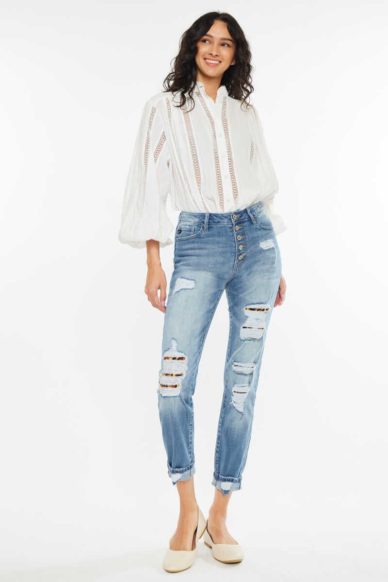 Peek-a-boo! This pair of high-rise ankle skinny has leopard patches under the distressed detailing, adding a little pizazz to any outfit! Featuring distressed detailing, fading, whiskering, and a 5-pocket design.