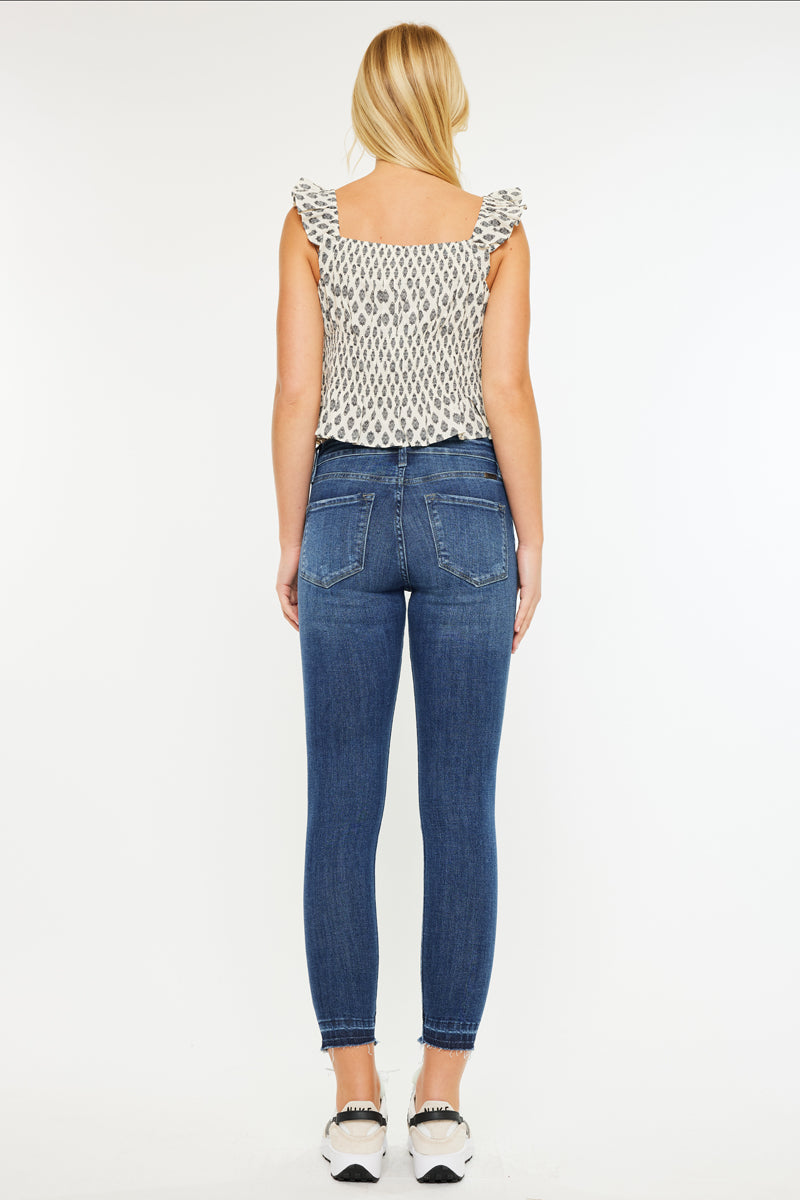 Our Loretta High Rise Ankle Skinny Jeans come in a medium wash with subtle fading and whiskering. These jeans stand out with their raw hem and subtle distress that give this pair an extra dose of style. Comes in a classic skinny jean fit that hugs every curve. Features 1 single button closure and a 5 pocket design.
