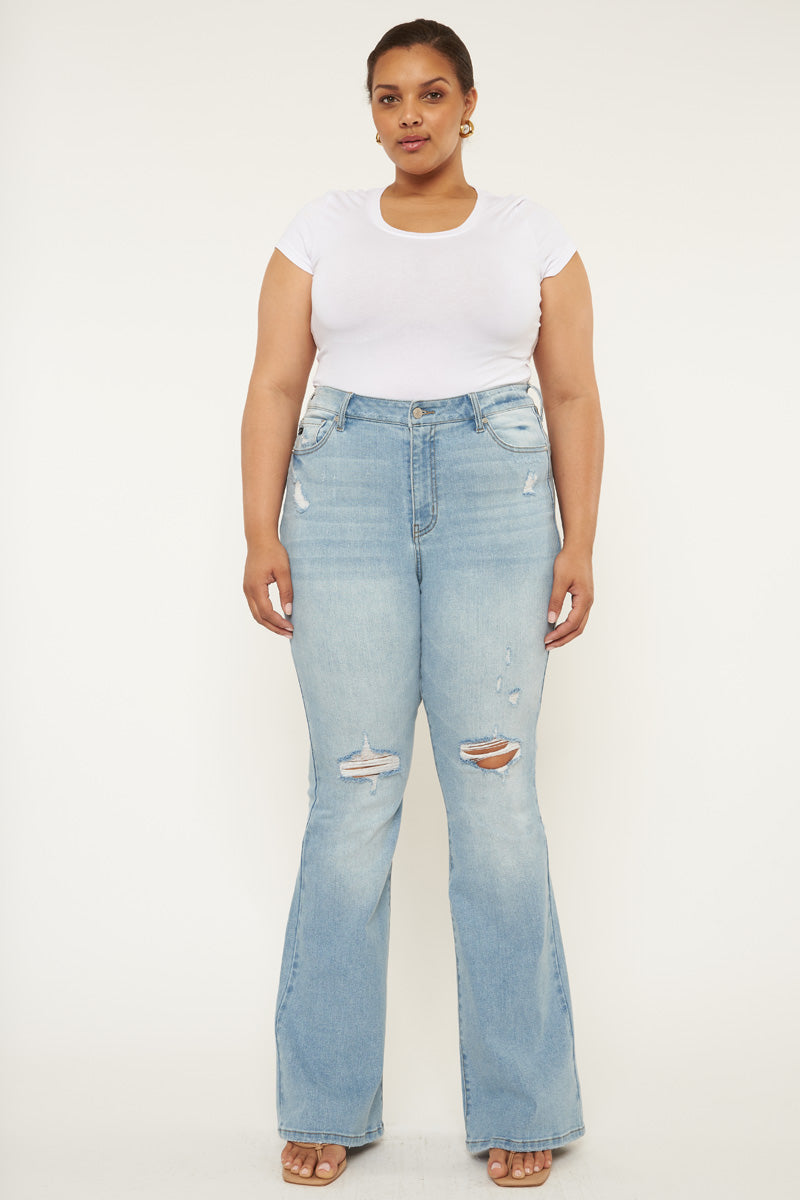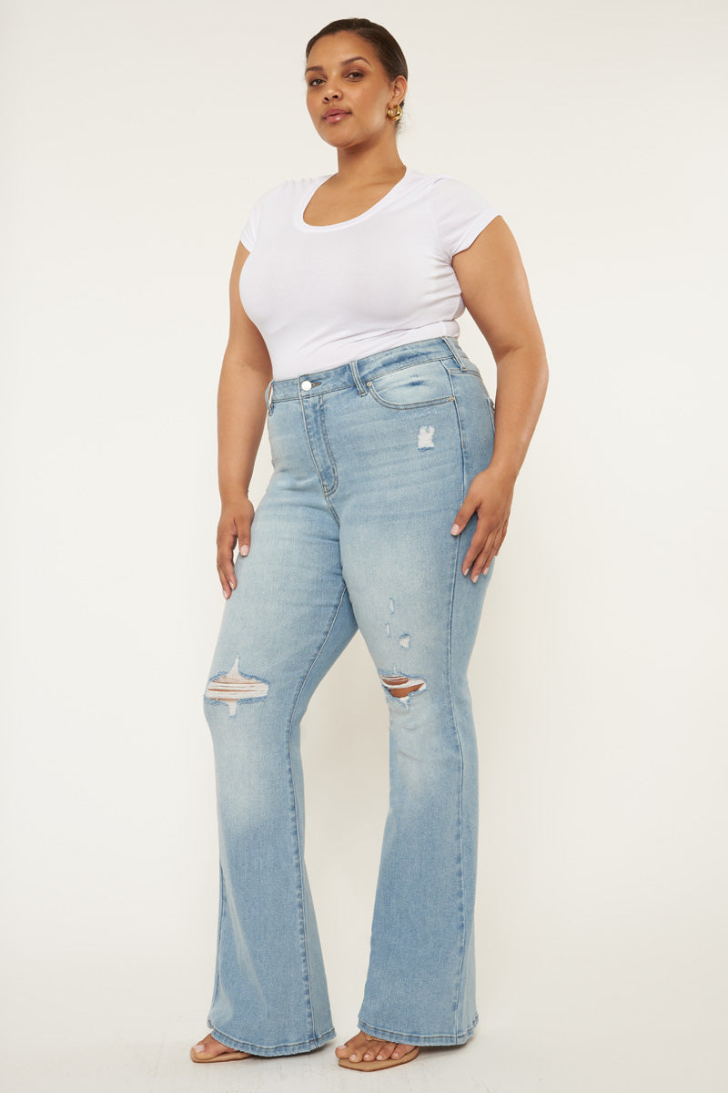 Our Lori High Rise Flare Jeans come in a flared cut with tattered distress marks, destruction at both knees, and a faded wash. Sits above the natural waistline as it tapers down the leg and begins to flare out at the upper calf. Made with buttery-soft super-stretch denim that moves with the body while retaining its shape. Features a classic five-pocket design, single-button front, and zip-fly closure.