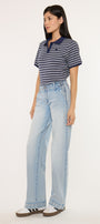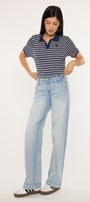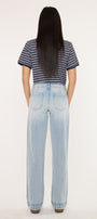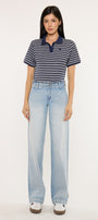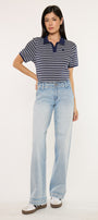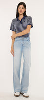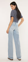 Lulu Mid Rise Wide Leg Trousers come in a light wash color style. This trendy style is meant to sit slightly below the waist and flare into a wide trouser leg. No distresses details for a clean look. At the front we have slant pockets with faint whiskering details. A thick fabric feel that allows you maximum comfort with your movements. Meant to keep its shape no matter the wears and washes. Features single button closure, zip fly, back patch pockets, and dart details.