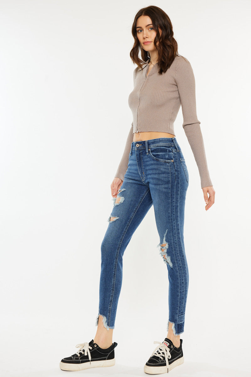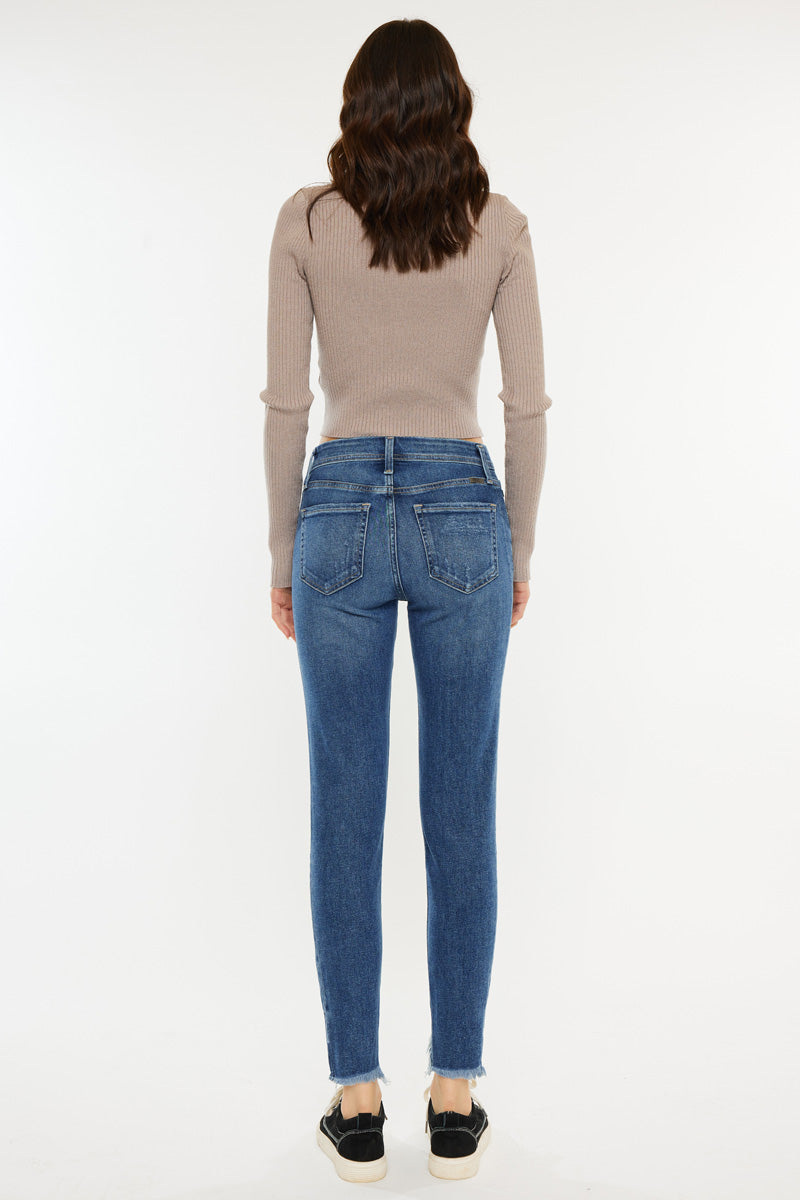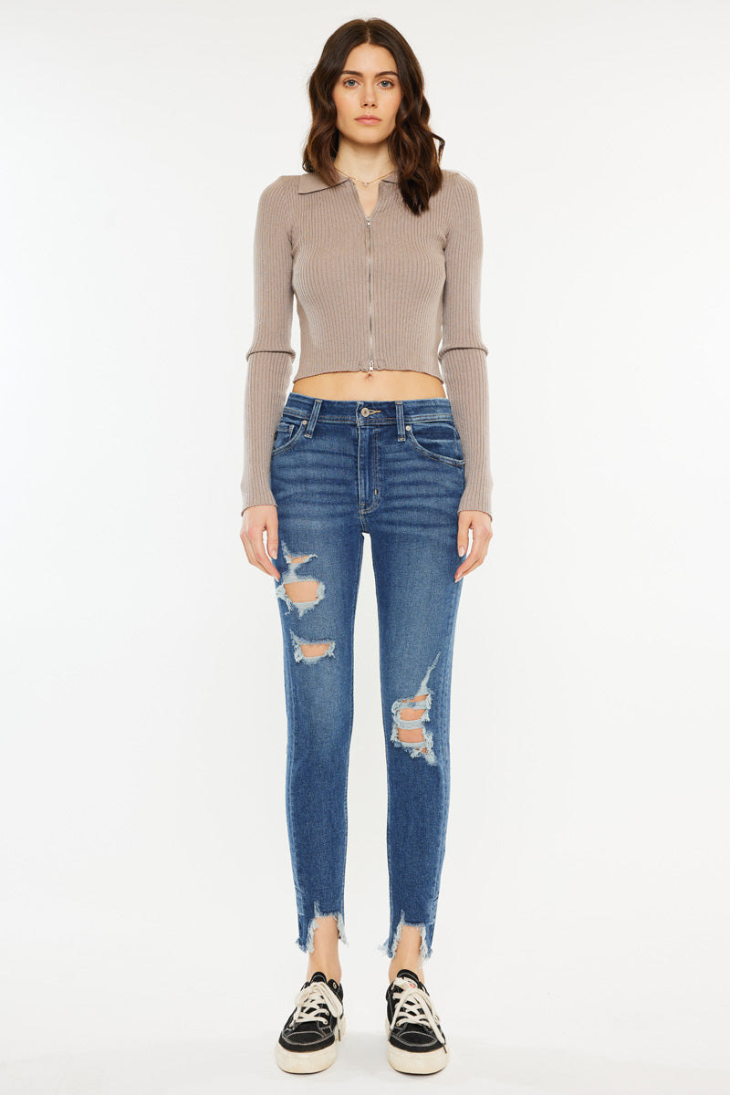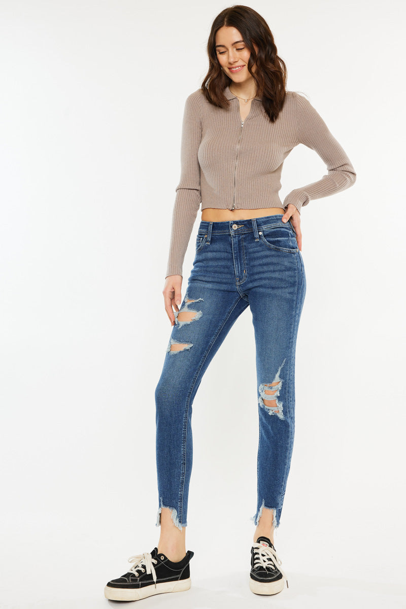 Our Luna High Rise Jeans come in an ankle skinny fit with a lightly faded wash, 3D whiskering, and distress detailing on the knee and upper thigh. It comes with a raw staggered hem featuring distress detail that gives it a more rugged chic look. Sits above the natural waistline as it tapers down the leg creating a figure-flattering silhouette that's perfect for dressing up or down. Made with smooth stretch denim that allows you to move with ease without bagging out after each wear. Features a classic five-pocket design, single-button front, and zip-fly closure.