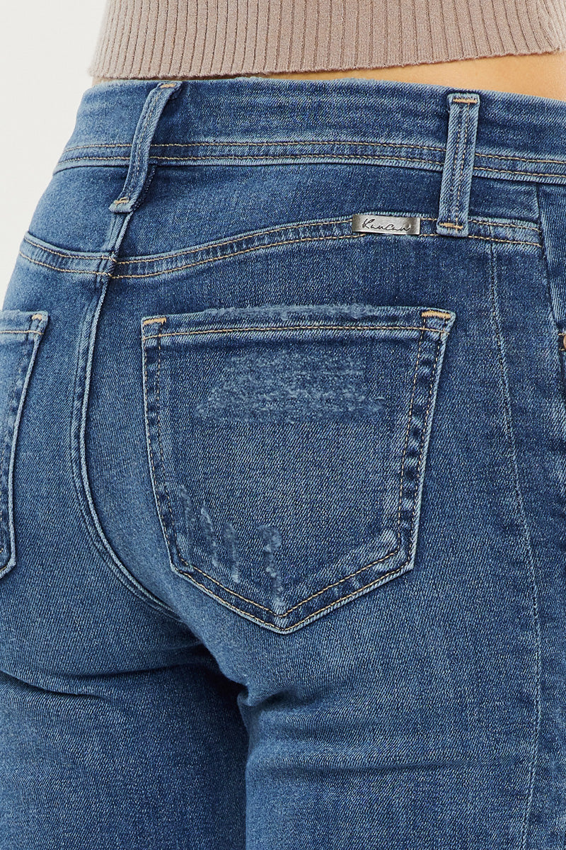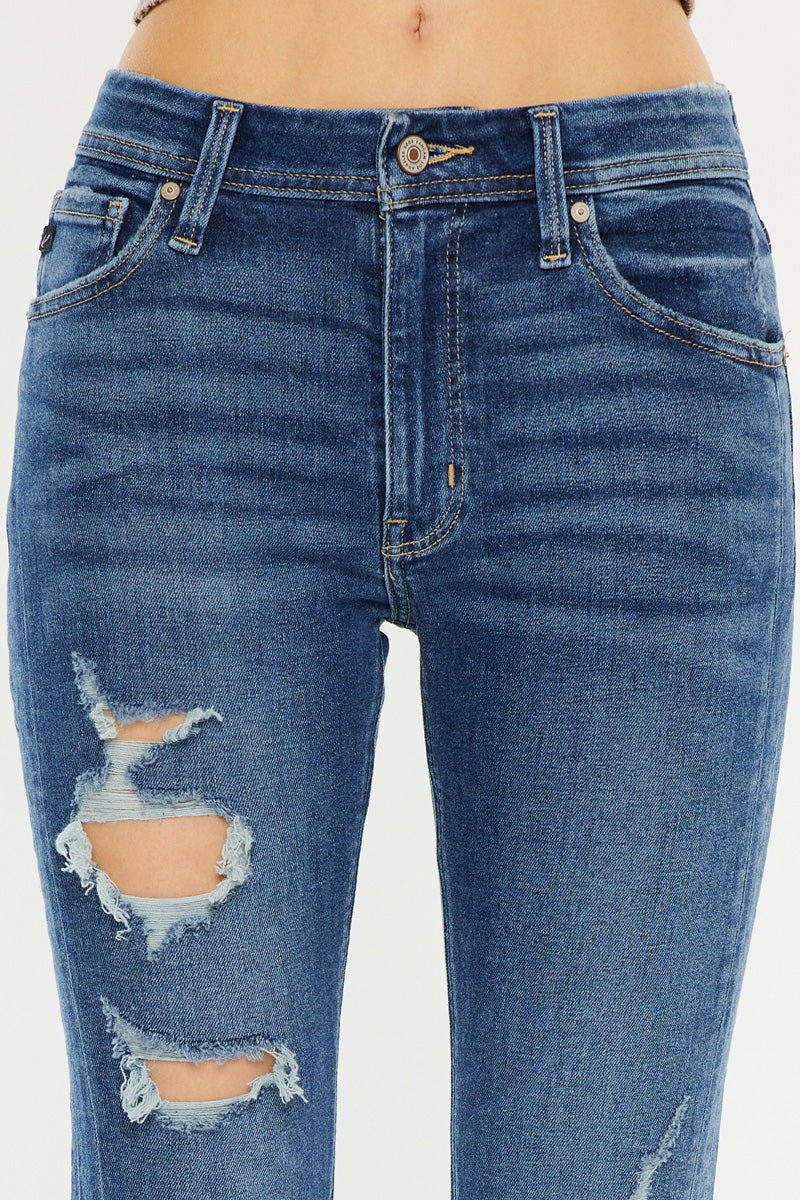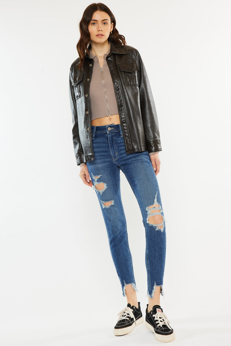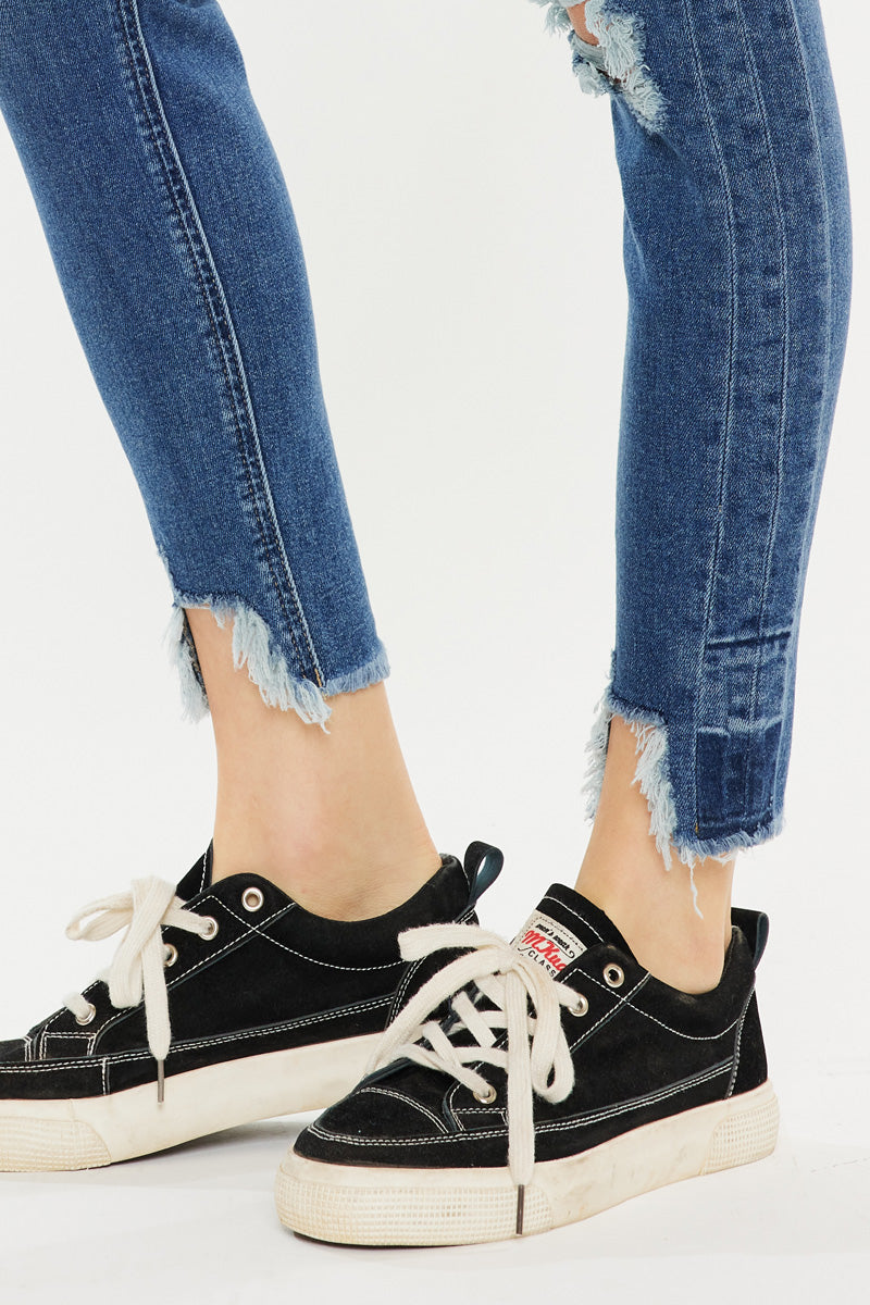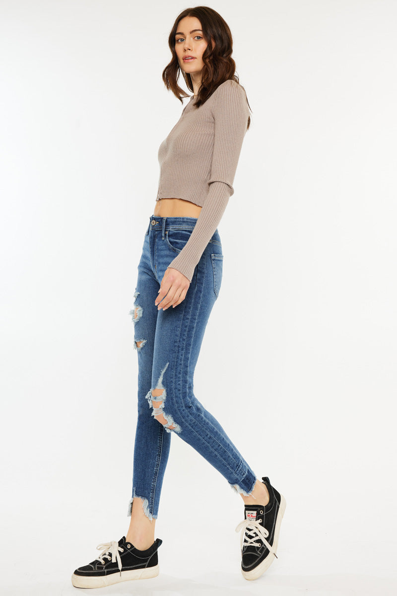 Our Luna High Rise Jeans come in an ankle skinny fit with a lightly faded wash, 3D whiskering, and distress detailing on the knee and upper thigh. It comes with a raw staggered hem featuring distress detail that gives it a more rugged chic look. Sits above the natural waistline as it tapers down the leg creating a figure-flattering silhouette that's perfect for dressing up or down. Made with smooth stretch denim that allows you to move with ease without bagging out after each wear. Features a classic five-pocket design, single-button front, and zip-fly closure.