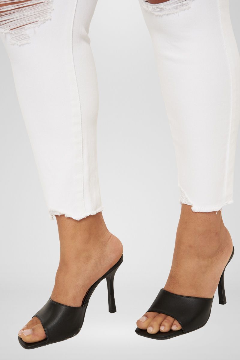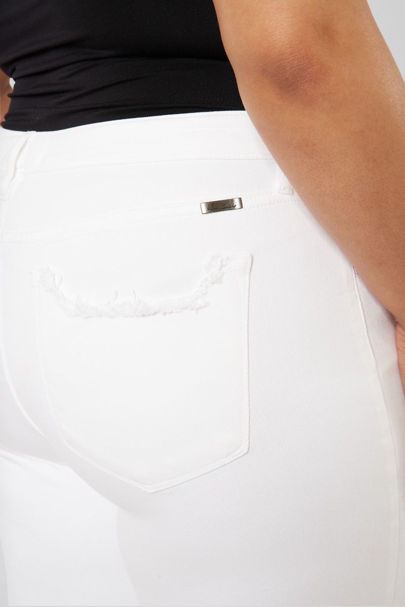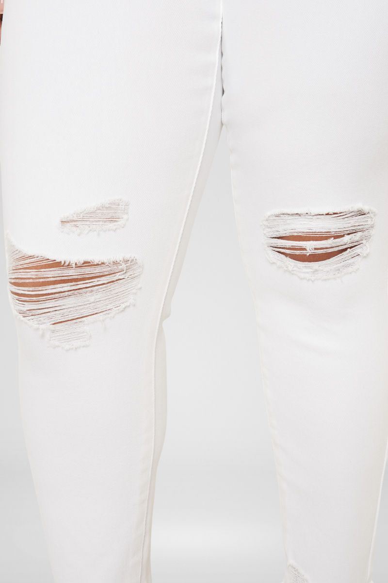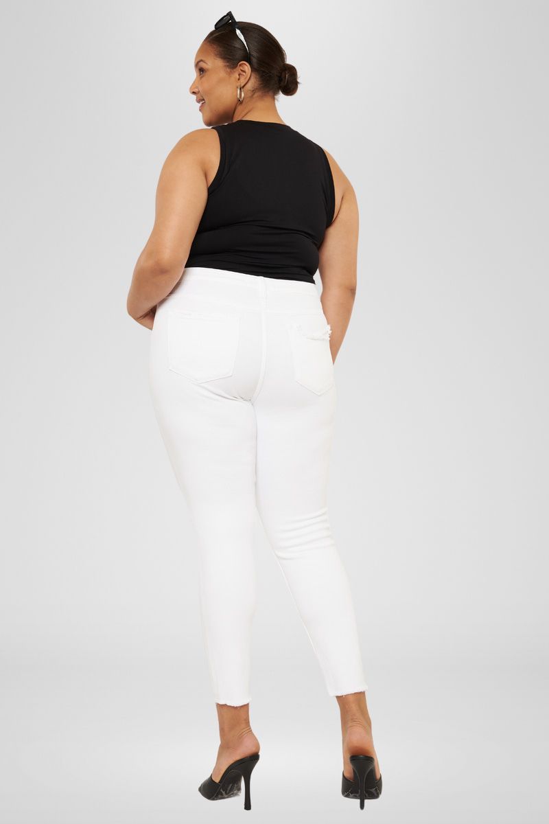 Add a flair to your style with our Lux Mid Rise Ankle Skinny Jeans, featuring a raw staggered fray hem, tattered destruction on the knees, and subtle distressed on the back pocket. Comes with a 5-pocket design, single-button front closure, and a zip fly.