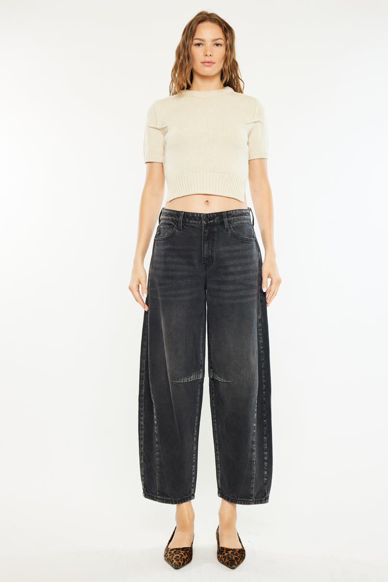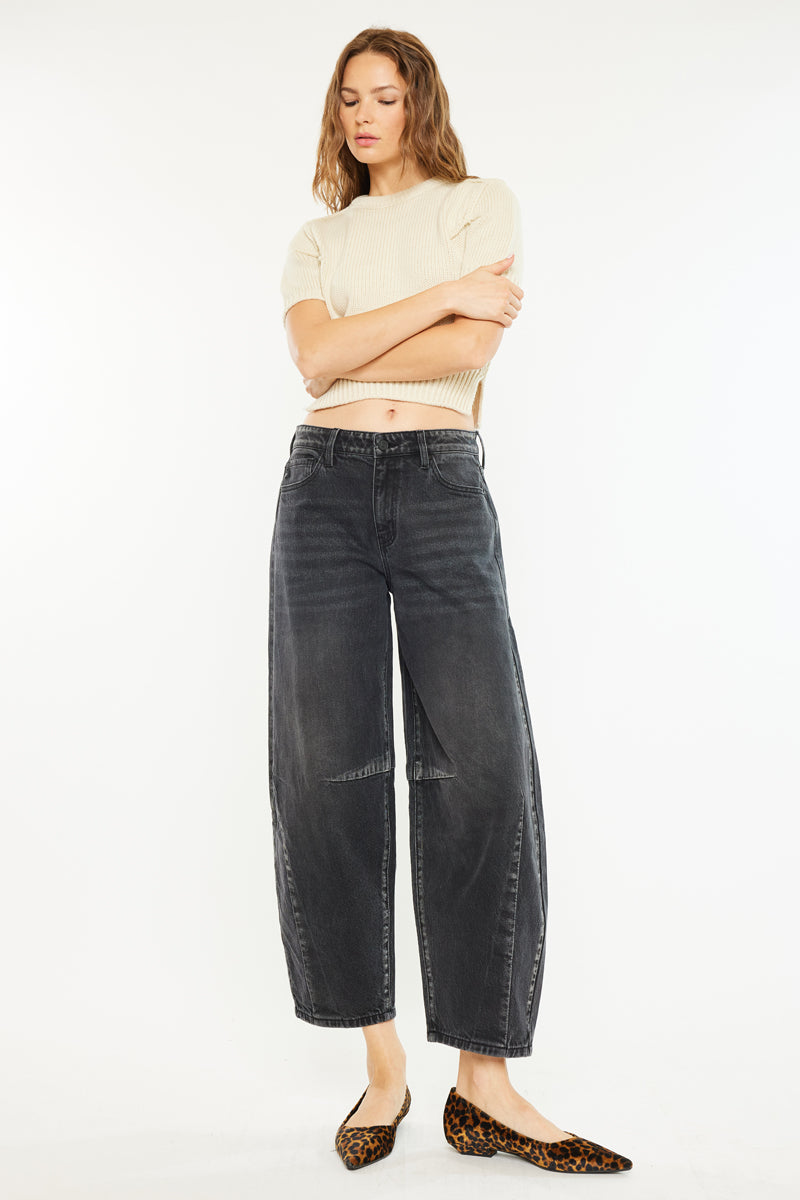 Luz High Rise Horseshoe Jeans is our newest style with a very distinct shape. The horseshoe is a jean that is curved into a wide leg and meant to give you a relaxed fit. Sitting at the waist it begins to flare at the hips into a wide silhouette and finally tapering at the bottom into a cropped frayed hem. With dart details that enhance the look of the jean making it seem almost balloon-like. If you desire a tighter and snugger fit, you may consider sizing down. The jeans feature the classic five-pocket style that is common to most jeans, complete with a single-button closure and a zip fly.