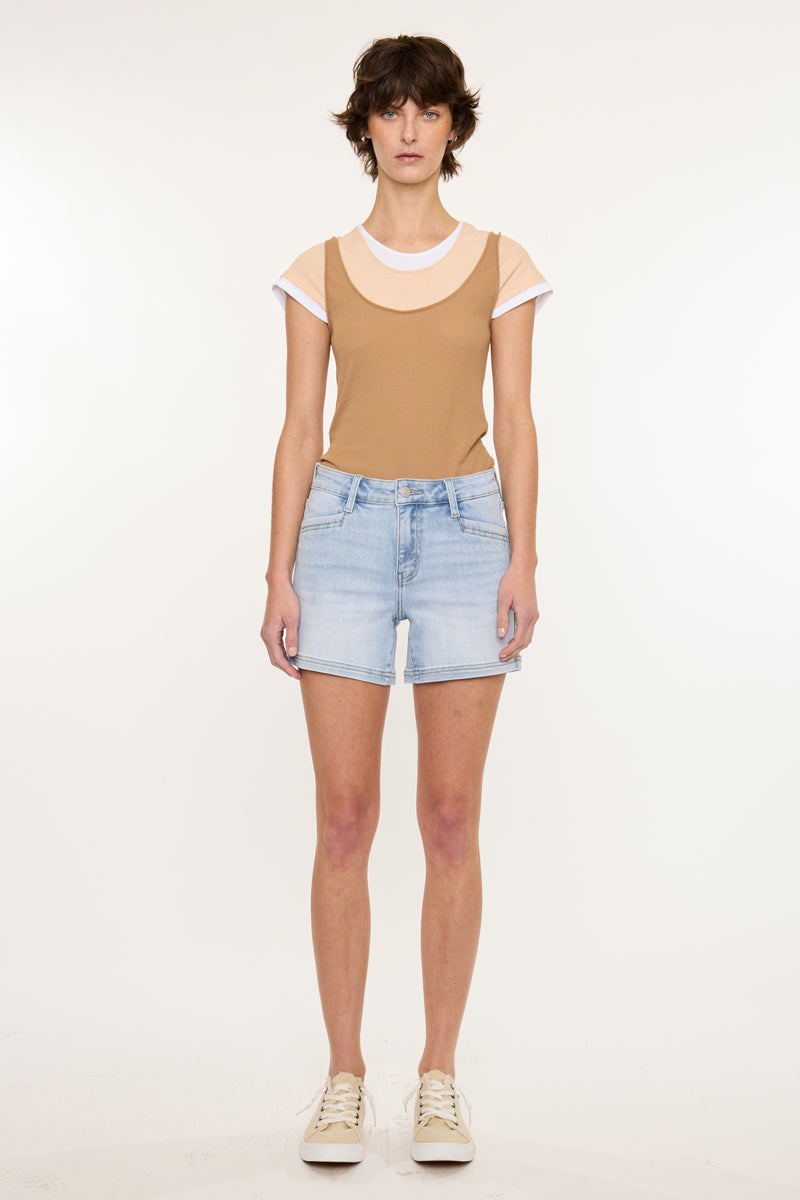 Lynne Essentials Mid Rise Shorts comes in a light wash color perfect for warm weather. Sits slightly below your belly button and ends mid-thigh. This soft denim short is meant to give you a tight fit while also allowing you the freedom to move with ease. At the front we have 2 side slant front pockets, a single button closure with a zipper fly.