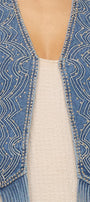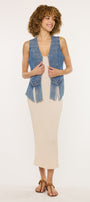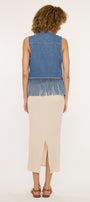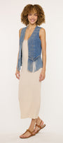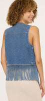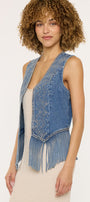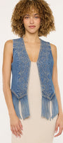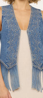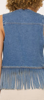 Introducing our Mabel Fringe Denim Vest. A studded detailed front, studs along the back neck and waistline of the vest, fringe going from the front to the back. A thick fabric feel that'll grantee the vest keeps its shape with every wear.