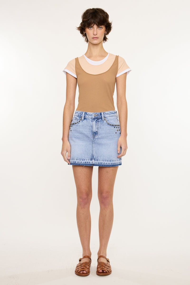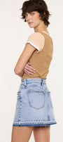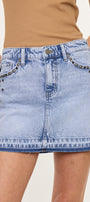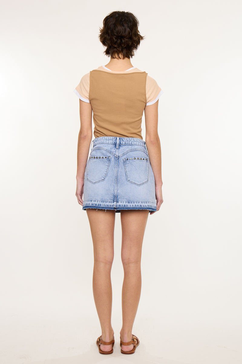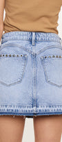 This western inspired skirt is the perfect for any occasion. With stud embellishments at the front and back pockets that let it stand out. Meant to sit slightly below your belly button and end mid-thigh. Features a single button closure, zipper fly, 5-pockets and a released hem.