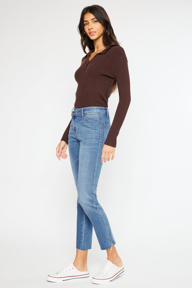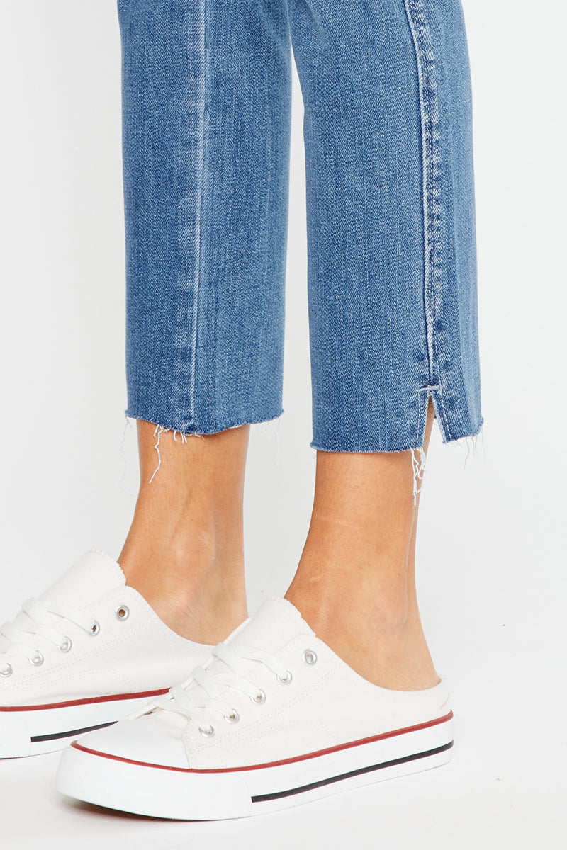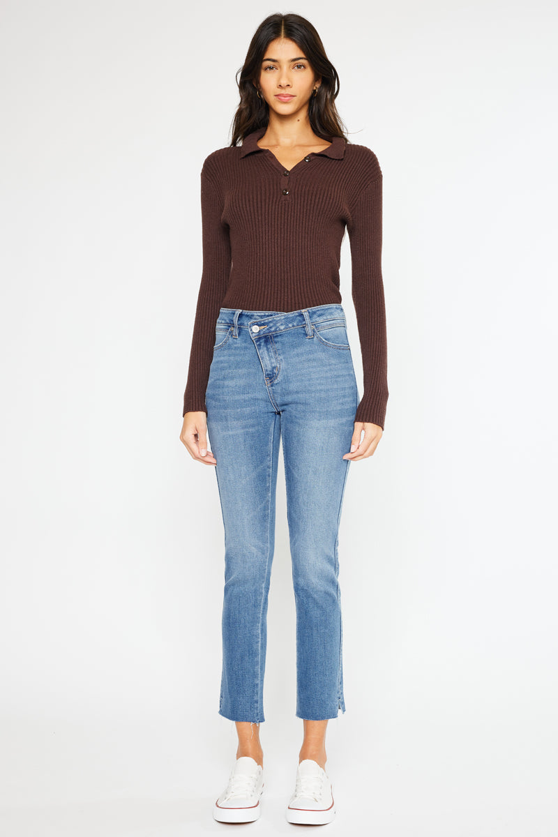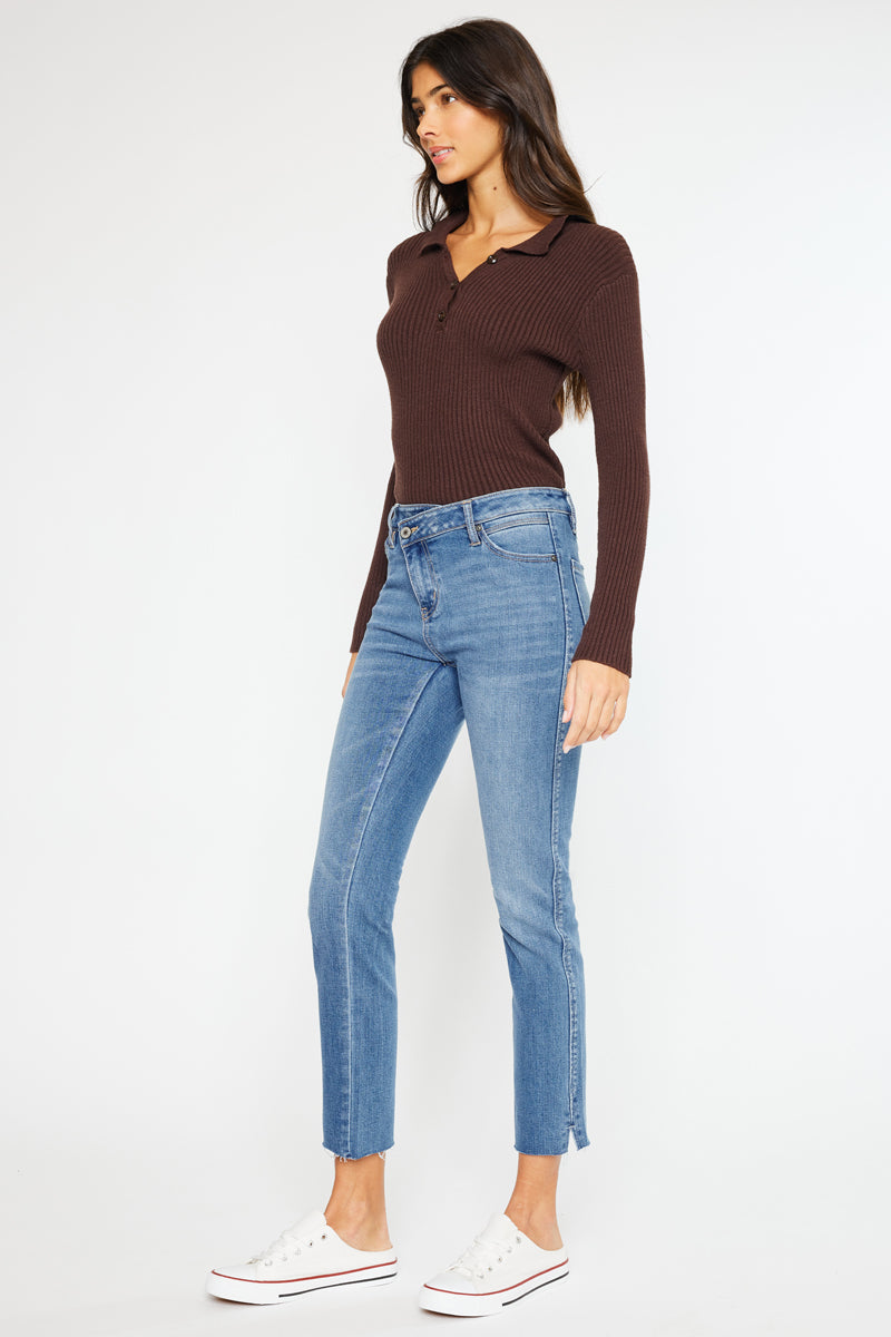 Our Nava High Rise Slim Straight Leg Jeans are a medium-washed slim straight style that extends the look of your legs while keeping you comfortable walking in them all day! Check out its unique crossover waistband that creates a V-shaped structure in the front. Comes with whiskering and light fading; they sit right above the waist and taper down to a raw hem. Features a side slit, 4-pocket style, and single front button closure, and zip fly.