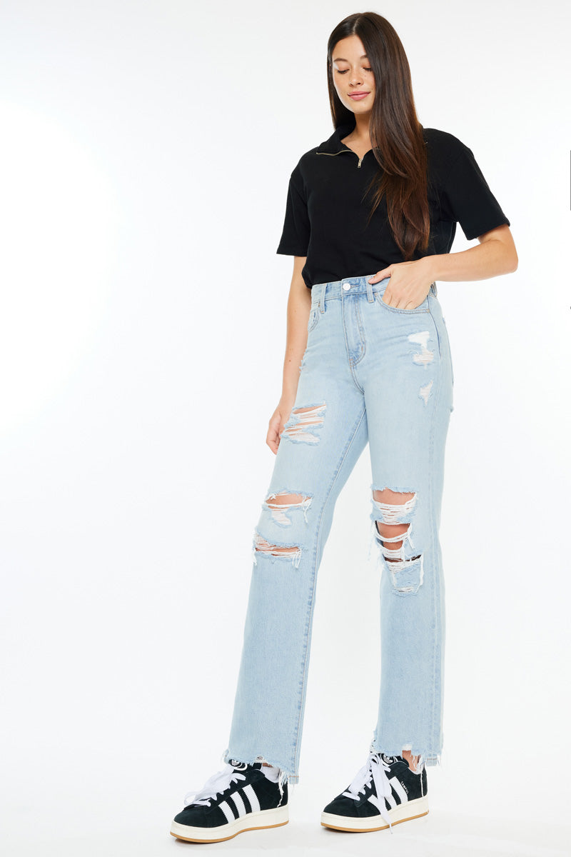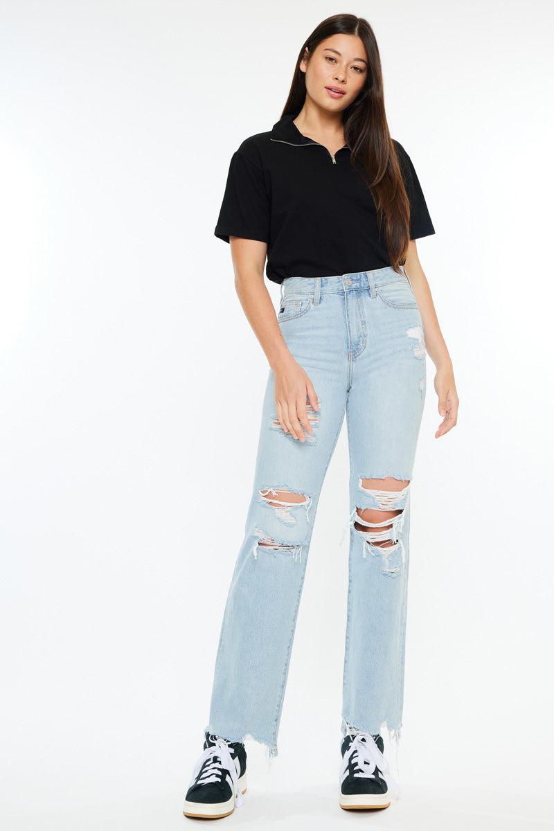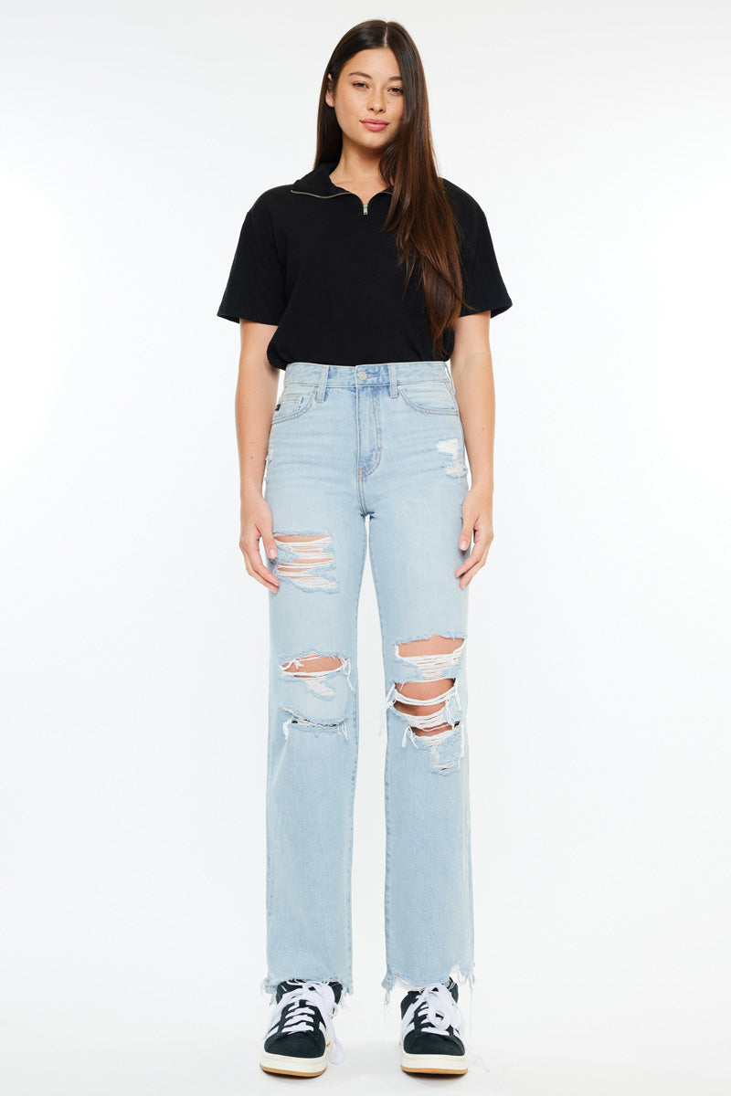 The Nerissa High Rise 90's Straight Jeans are the perfect bottoms for everyday leisure. Grab these pair of jeans on a morning walk, errand run, or a brunch date with your friends. Comes with slight whiskering and rips to elevate your look. Features five-pocket design, one-button enclosure, and frayed hems.