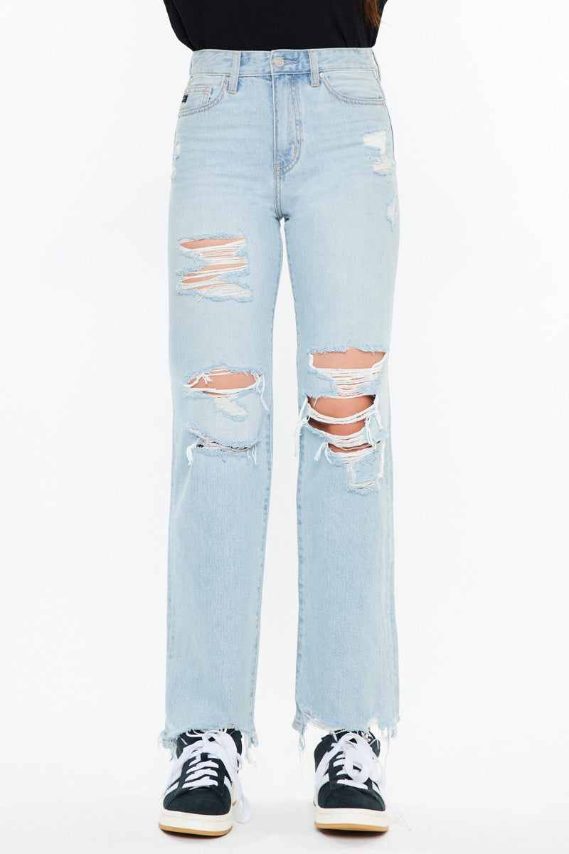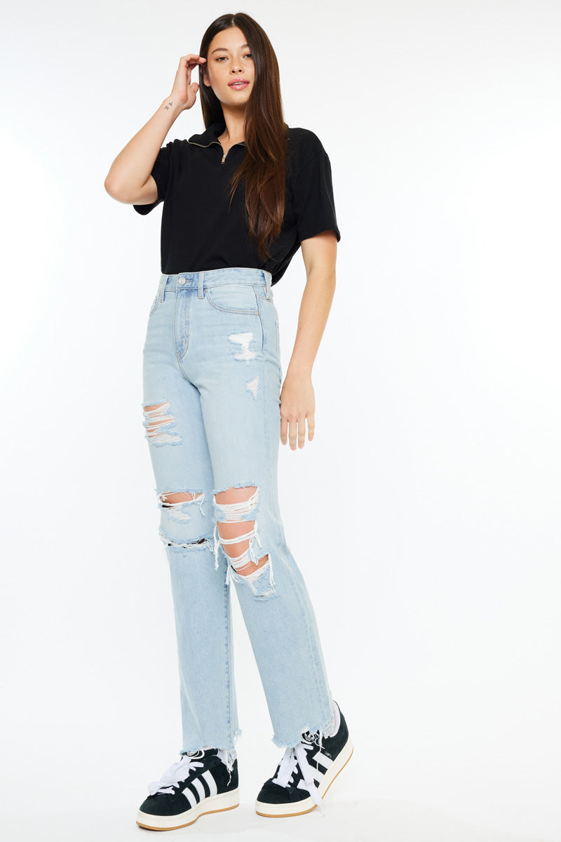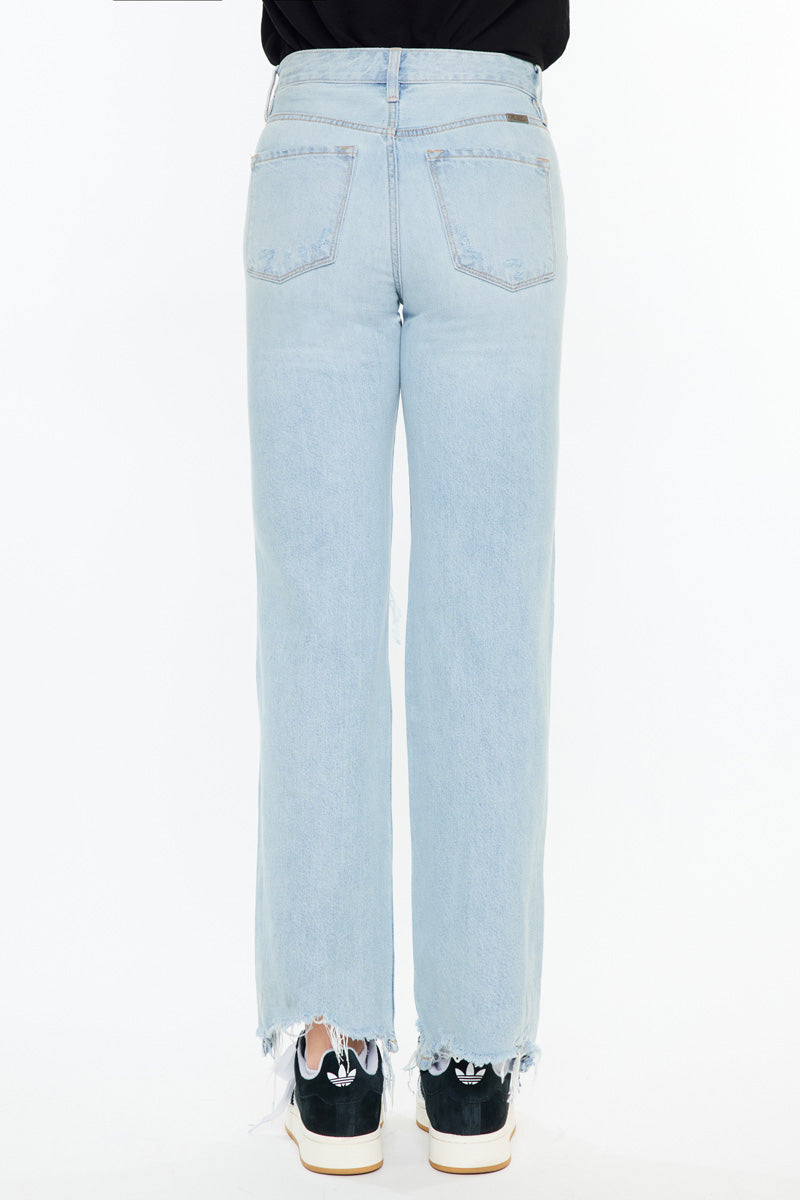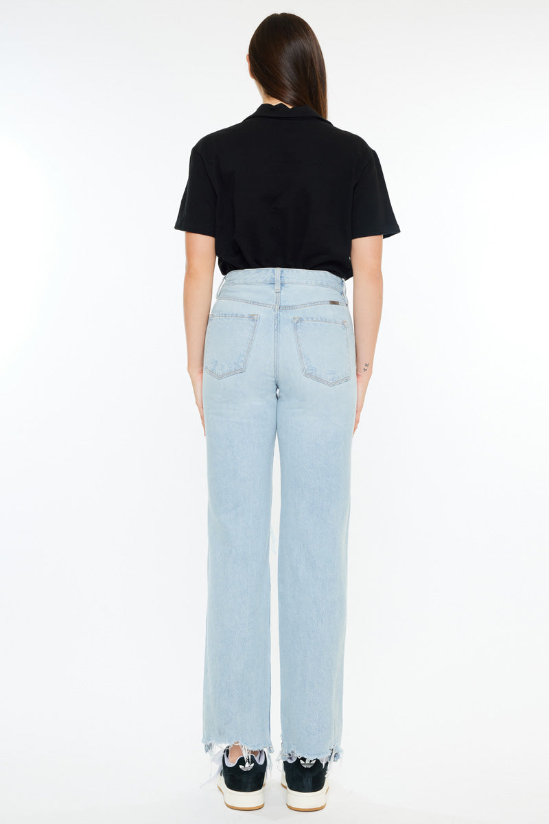 The Nerissa High Rise 90's Straight Jeans are the perfect bottoms for everyday leisure. Grab these pair of jeans on a morning walk, errand run, or a brunch date with your friends. Comes with slight whiskering and rips to elevate your look. Features five-pocket design, one-button enclosure, and frayed hems.