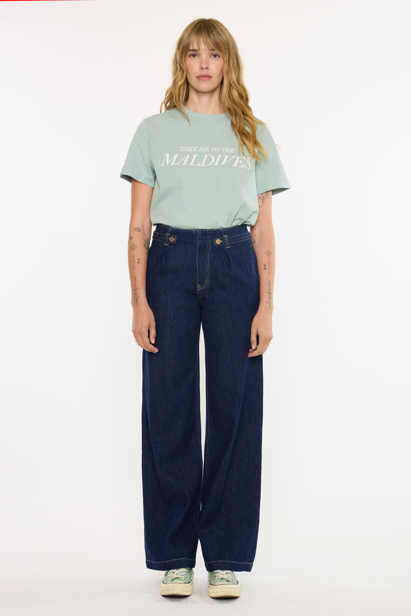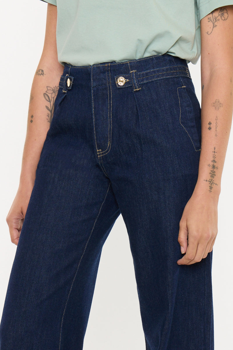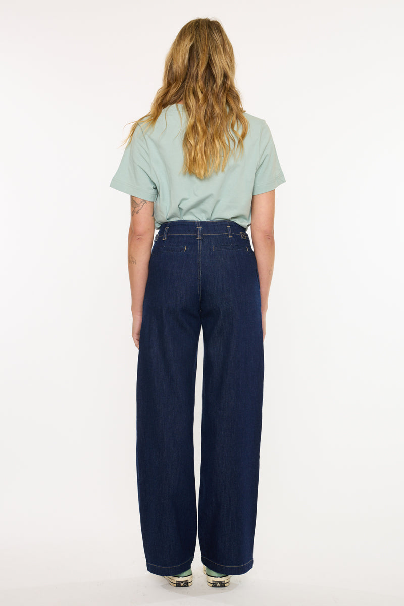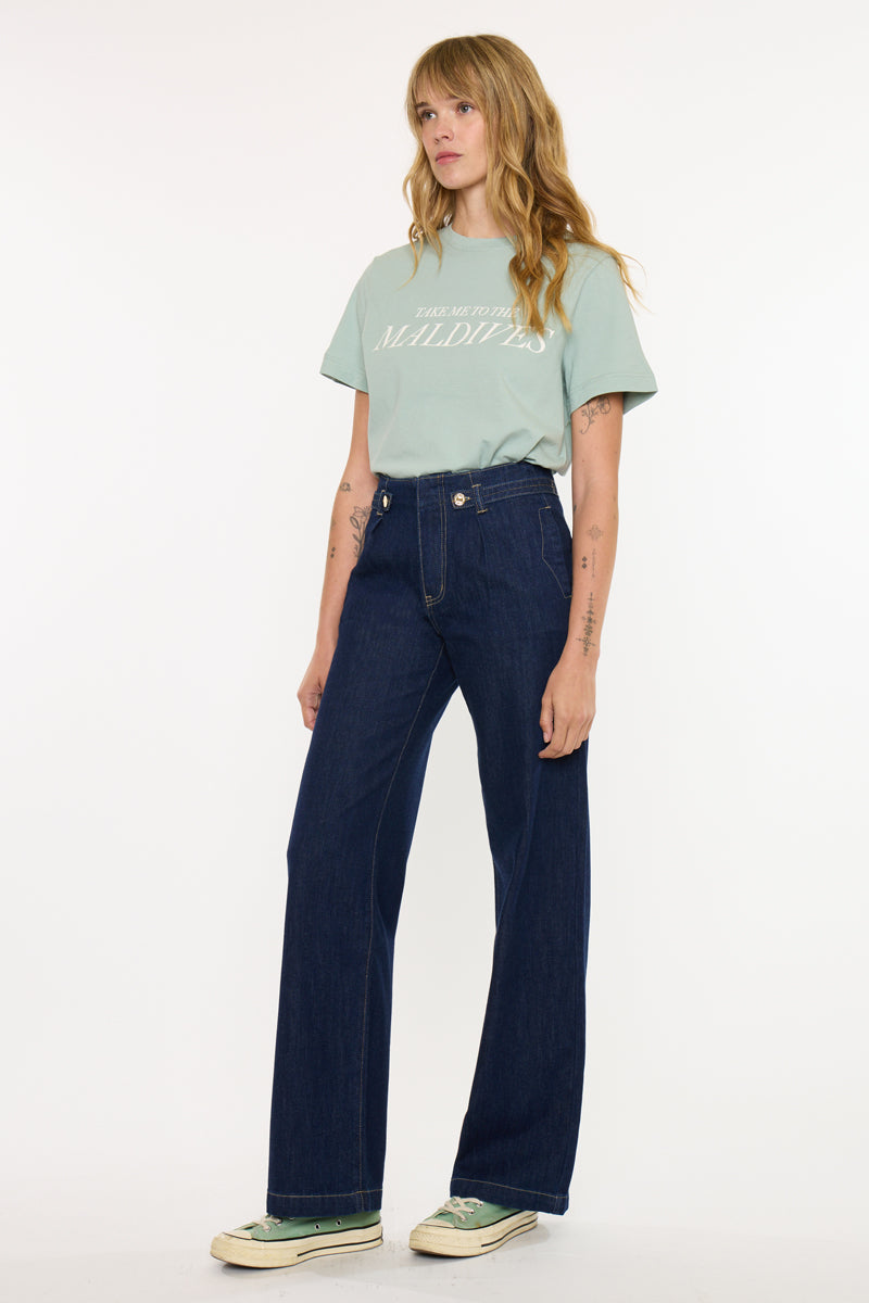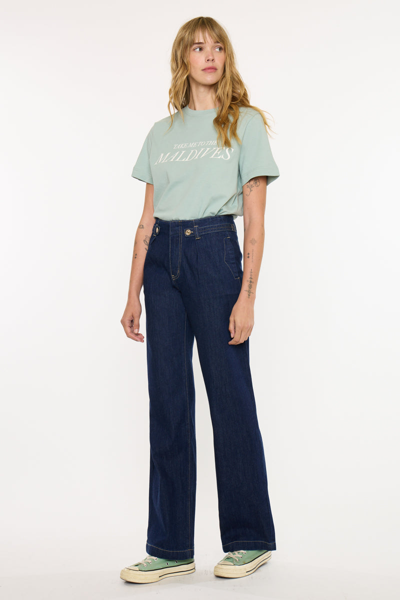 Niveah High Rise Wide comes in a clean dark wash color that is perfect for any occasion. Dress it up or style it casual. This trouser-like style has waist tab details that makes it stand out. Classic button closure, zipper fly, front slant pockets and back dark with welt pockets.