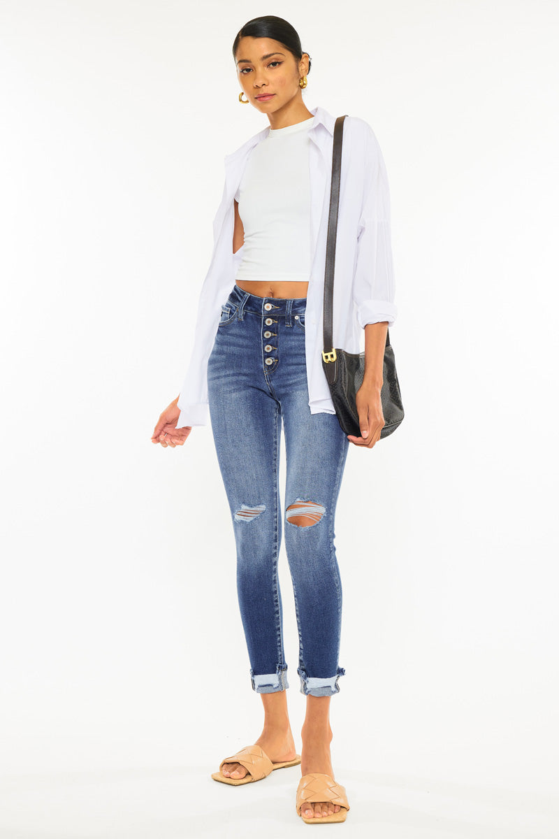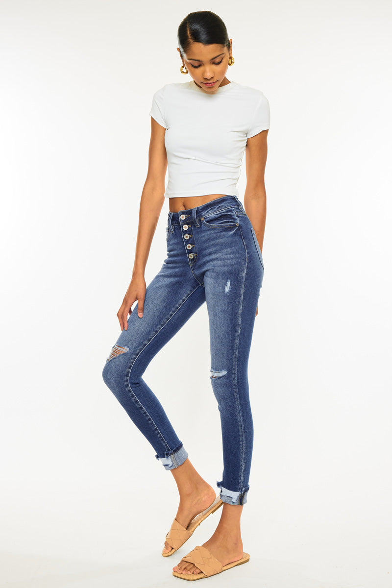Our Norah High Rise Jeans come in an ankle skinny cut with open-knee destruction and a folded hem. Sits slightly above the natural waistline as it tapers down the leg hitting right at the ankle creating a casual and carefree look. Made with butter-soft stretch denim that's breathable and flexible, allowing you to move with comfort and ease. Features a classic five-pocket design and five-button front closure.
