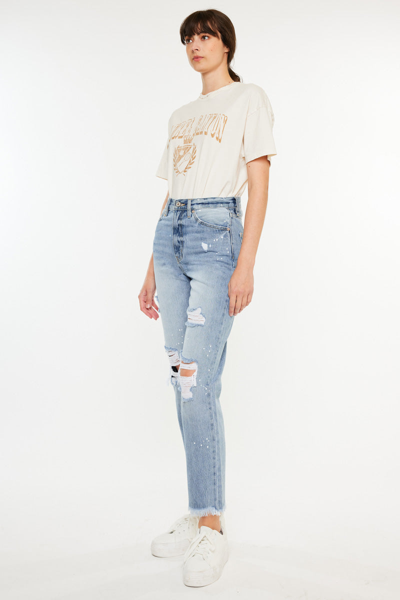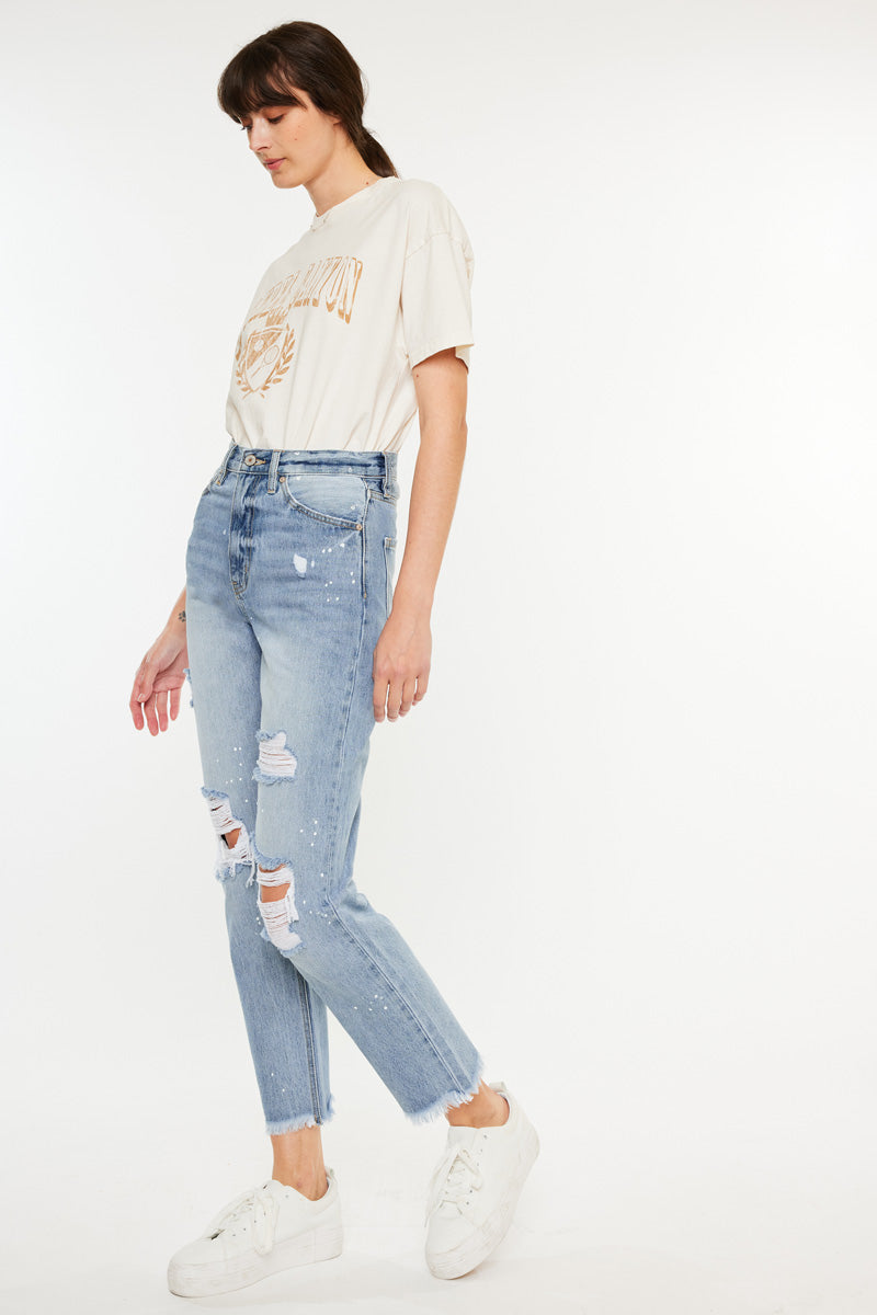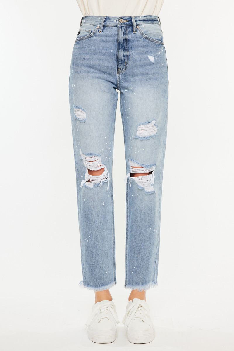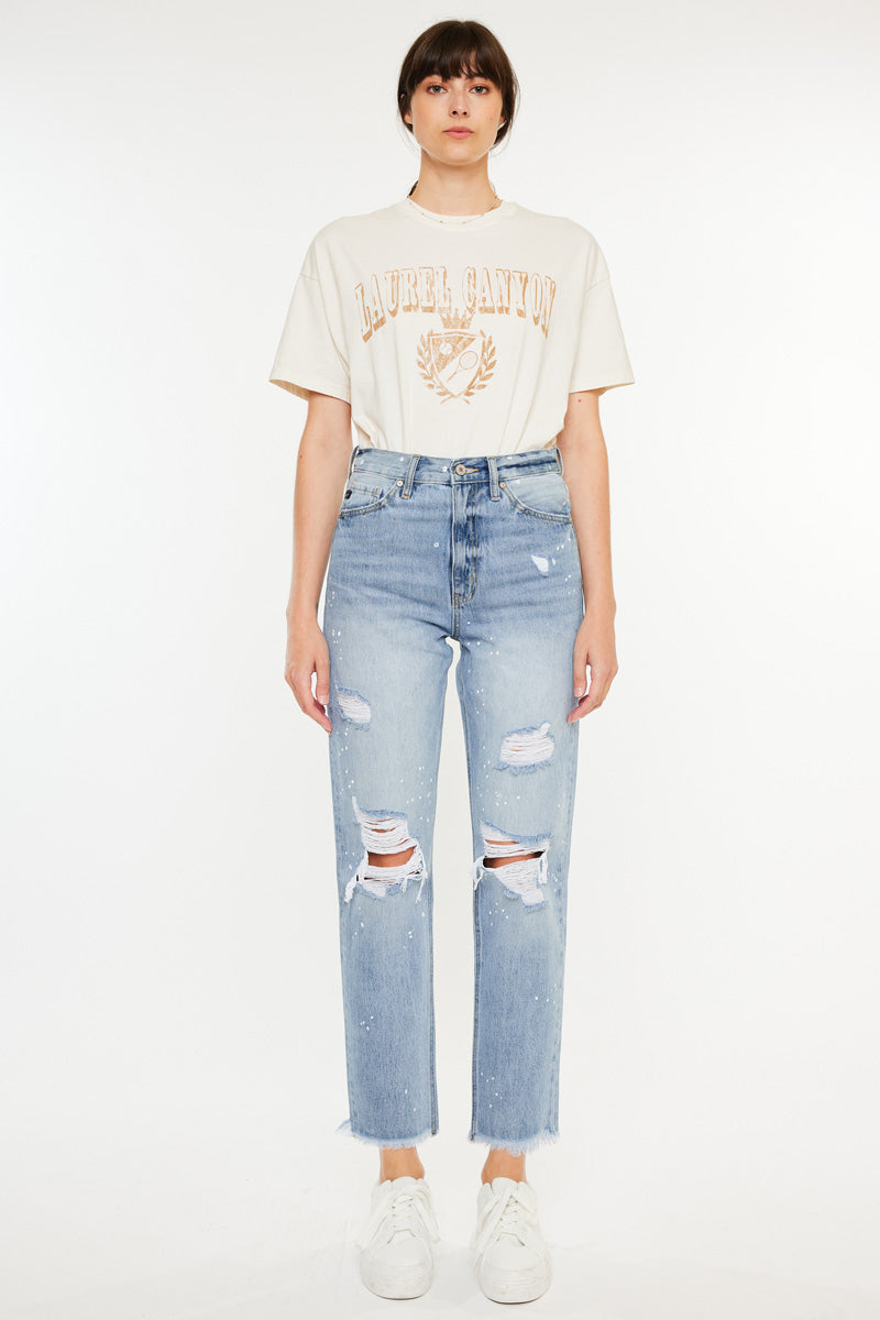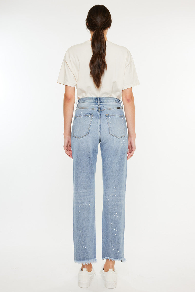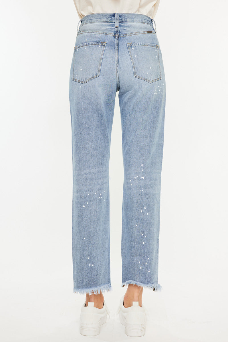 These Oceane High Rise Slim Straight Jeans are chic and trendy. This slim-fit comes with fading, whiskering, and medium distress. With unique detailing such as light paint splattering and frayed hem for a lived-in look. You can't go wrong with these beautiful medium shade blue jeans, fit for the everyday woman.