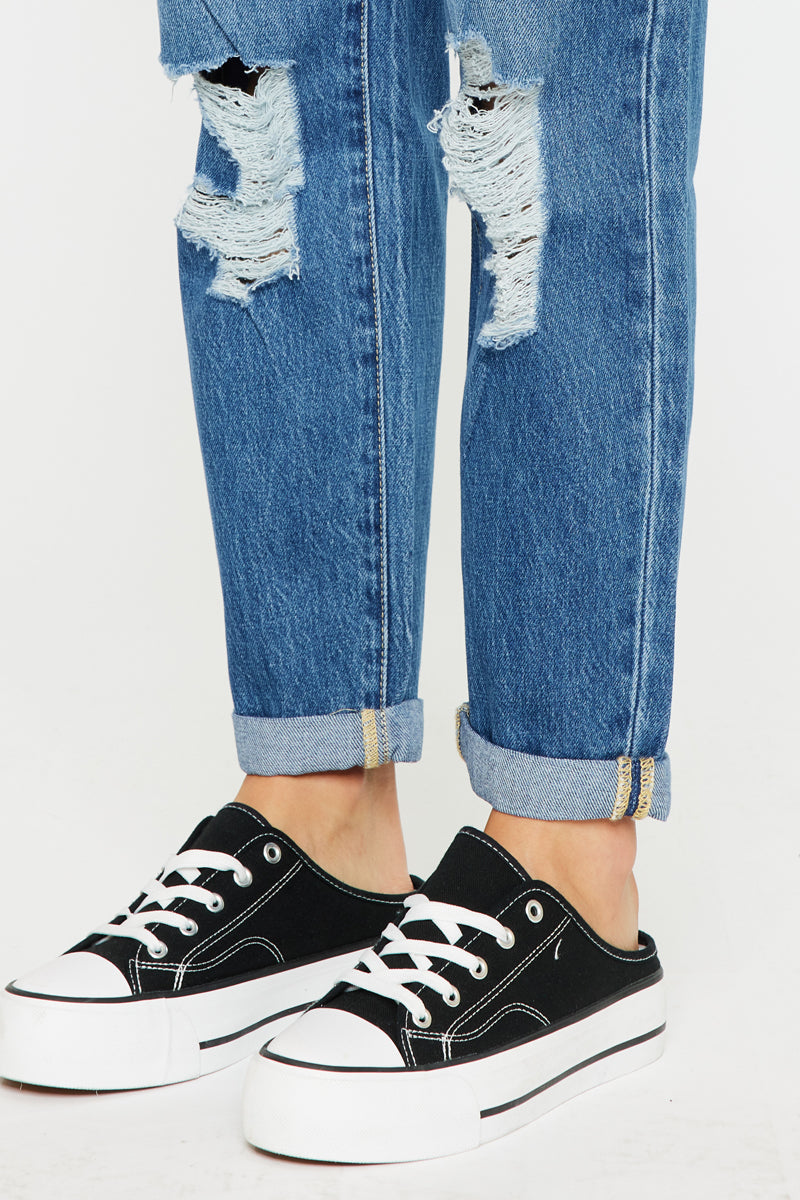Our Olivia Ultra High Rise Jeans come in a cute boyfriend cut with open knee destruction, paperbag waist, and a folded hem. Sits high above the natural waistline as it relaxes down the legs giving you a comfortable fit that's trendy and stylish. Made with rigid denim that holds its shape while giving you a comfortable fit and feel every time you wear them. Features a four-pocket design, single-button front, and zip-fly closure.